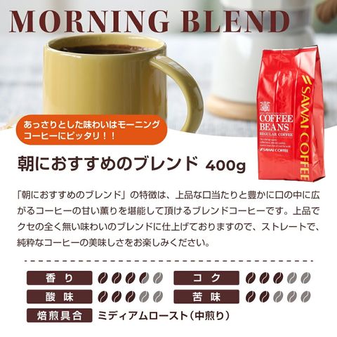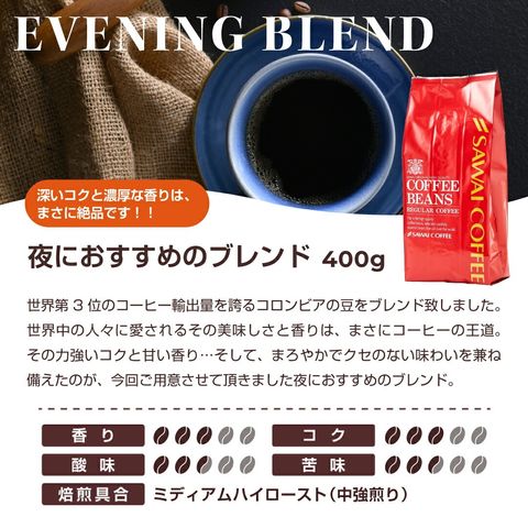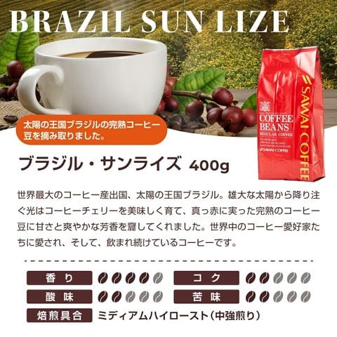 | 内容量 | ・朝におすすめのブレンド 400g×1袋 ・ブラジルサンライズ 400g×1袋 ・夜におすすめのブレンド 400g×1袋 ・アフタヌーンブレンド 400g×1袋 |