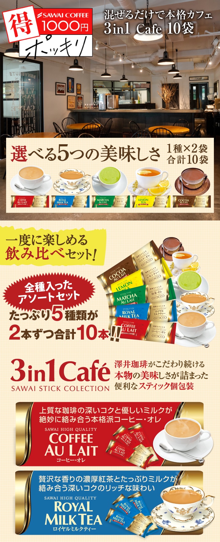 インスタント スティック 1000円ポッキリ お試し カフェオレ 紅茶 ココア 抹茶 アソート 各2袋 個包装 送料無料 3in1カフェ 10袋 澤井珈琲 追跡ゆうメール