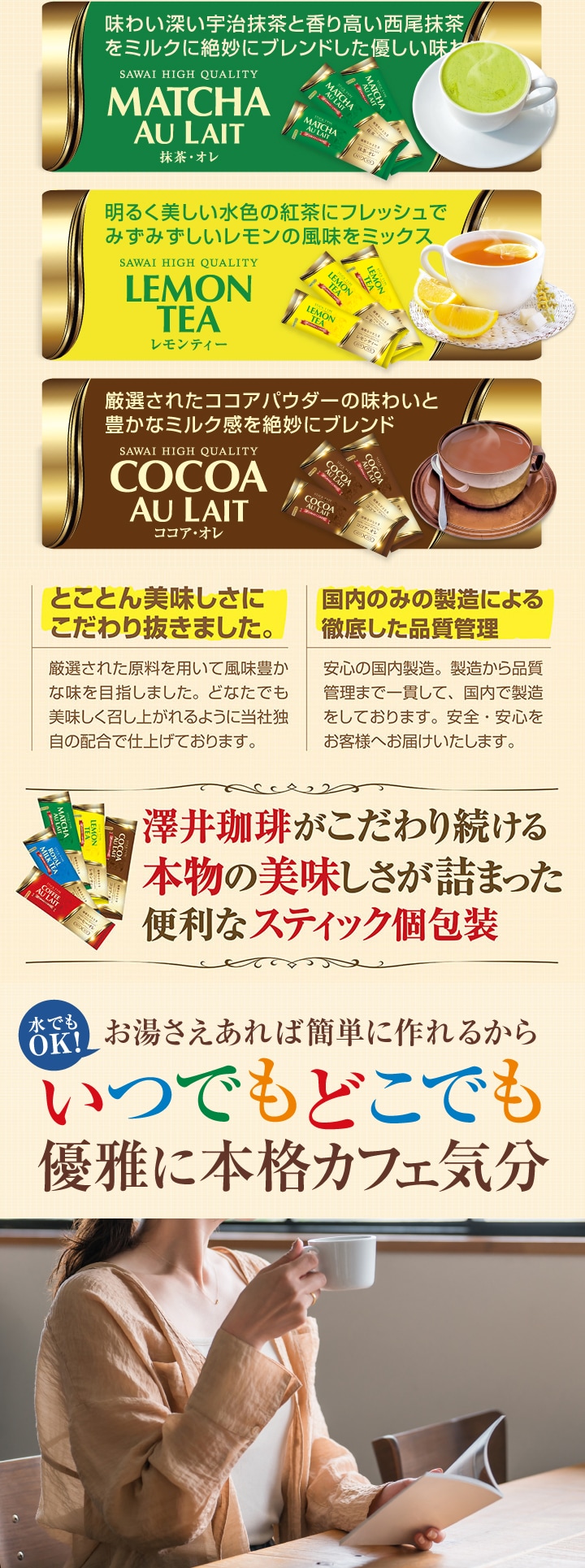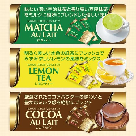 ●コーヒーオレ 13g×2袋 ●ロイヤルミルクティー 14g×2袋 ●抹茶・オレ 15g×2袋 ●レモンティー 9g×2袋 ●ココア・オレ 17g×2袋 |