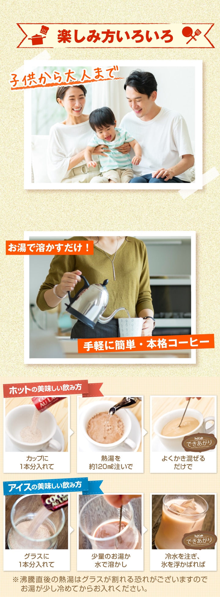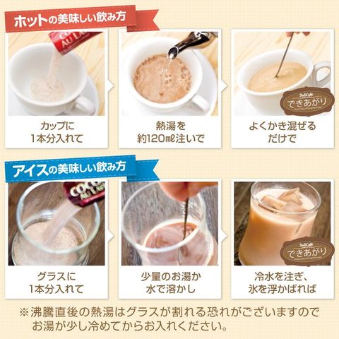 | 原材料 | 【コーヒーオレ】 砂糖、麦芽糖、デキストリン、植物油脂、乳糖、インスタントコーヒー、脱脂粉乳、食塩/リン酸塩(K、Ca) 、カゼインNa、香料、乳化剤、調味料(無機塩)(一部に乳成分を含む) 【ロイヤルミルクティー】 砂糖、乳糖、デキストリン、植物油脂、脱脂粉乳、紅茶エキス、バターオイル、加糖脱脂練乳 、乳たんぱく、食塩、紅茶、無糖練乳/リン酸塩(K、Ca、Na)、乳化剤、香料、カゼインNa(一部に乳成分・大豆を含む) 【抹茶・オレ】 砂糖、デキストリン、脱脂粉乳、植物油脂、抹茶、加糖脱脂練乳、全粉乳、乳糖、食塩、乳たんぱく、バターオイル/リン酸塩(K、Ca、Na)、カゼインNa、乳化剤、甘味料(アセスルファムK、スクラロース)、香料(一部に乳成分・大豆を含む) 【レモンティー】 砂糖、麦芽糖、紅茶エキス、乳糖、デキストリン、紅茶/香料、酸味料、環状オリゴ糖、野菜色素、カラメル色素(一部に乳成分・大豆を含む) 【ココア・オレ】 砂糖、デキストリン、ココアパウダー(ココアバター17%~19%)、植物油脂、食塩、脱脂粉乳、乳たんぱく/リン酸塩(K、Na)、増粘剤(CMC-Na)、香料、微粒二酸化ケイ素、乳化剤、甘味料(アセスルファムK、スクラロース)(一部に乳成分・大豆を含む) |