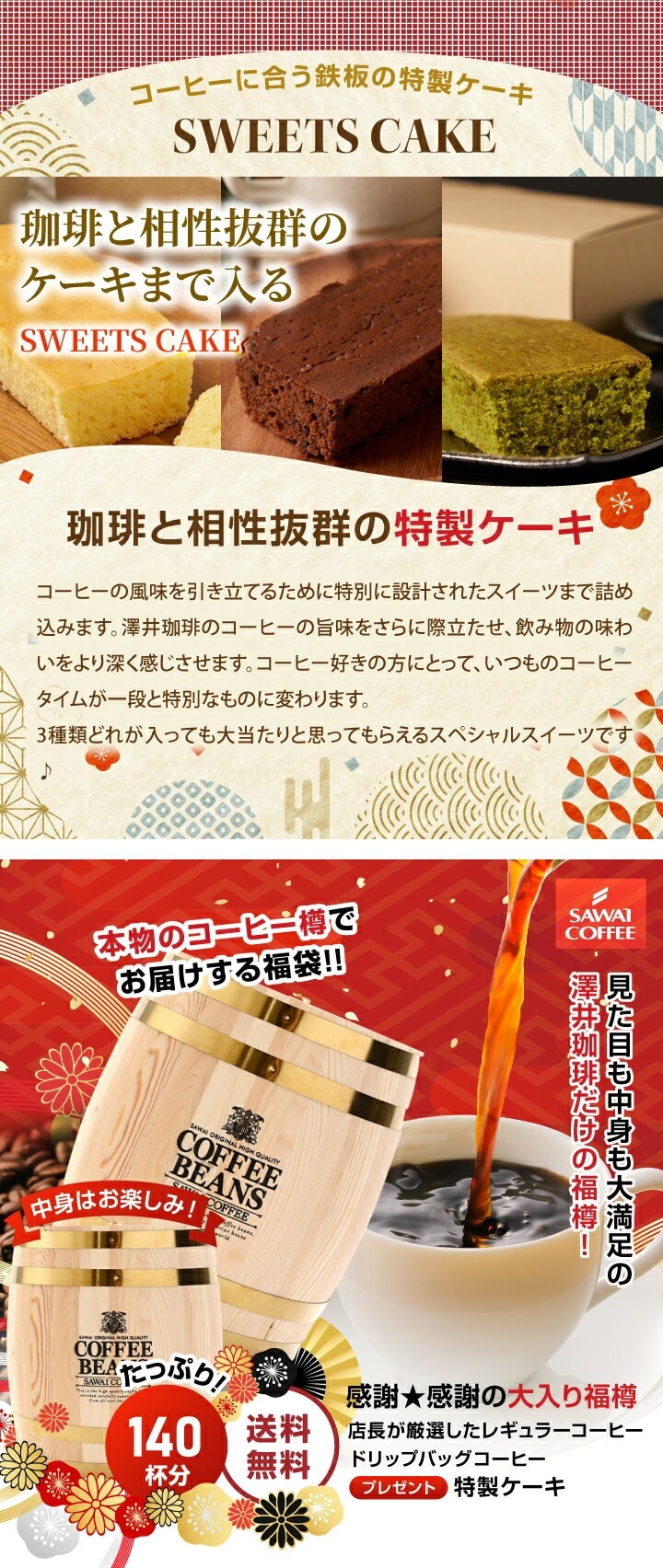 | 本物の木の樽にたっぷり140杯分のコーヒーを詰め込んだ、特別な福袋! この商品は、焼きたてのレギュラーコーヒー100杯分と、香りが長持ちするドリップバッグコーヒー40杯分がセットになった福樽です。さらに、珈琲と相性抜群のベイクドケーキもついてきます。本物の木の樽でお届けするので、インパクトも抜群です。中身は楽しみながら開けていただけるサプライズ感満載の商品です。 インパクトのある木の樽でお届け! 澤井珈琲だけが提供する特別な福樽は、本物の木の樽に詰められています。この樽は、見た目のインパクトが大きく、開ける前からワクワク感を感じさせます。開けた瞬間に広がるコーヒーの香りと共に、毎日のカフェタイムを贅沢に彩ります。お部屋のインテリアにもなりそうなこの樽は、使い終わった後も楽しめる一品です。 店長厳選!焼きたてのレギュラーコーヒー100杯分 やっぱり澤井珈琲の福袋には、この焼きたてのレギュラーコーヒーが欠かせません。店長が厳選したコーヒー豆を使用し、毎日美味しいコーヒーを楽しんでいただけます。今回の福樽では、内容はあえて秘密にしていますが、どのコーヒーも香り高く、満足感を味わえるものばかりです。100杯分も入っているので、たっぷり楽しめます。 手軽に楽しめるドリップバッグと相性抜群のベイクドケーキ 忙しい時でも手軽に楽しめるドリップバッグが40杯分も入っています。アロマとじこめ製法により、いつでも新鮮な香りを楽しめるのがポイントです。そして、ベイクドケーキは、飽きの来ない甘さとしっとりとした口当たりになっており、コーヒーと一緒に楽しむことで、カフェタイムがより充実したひとときになります。 |