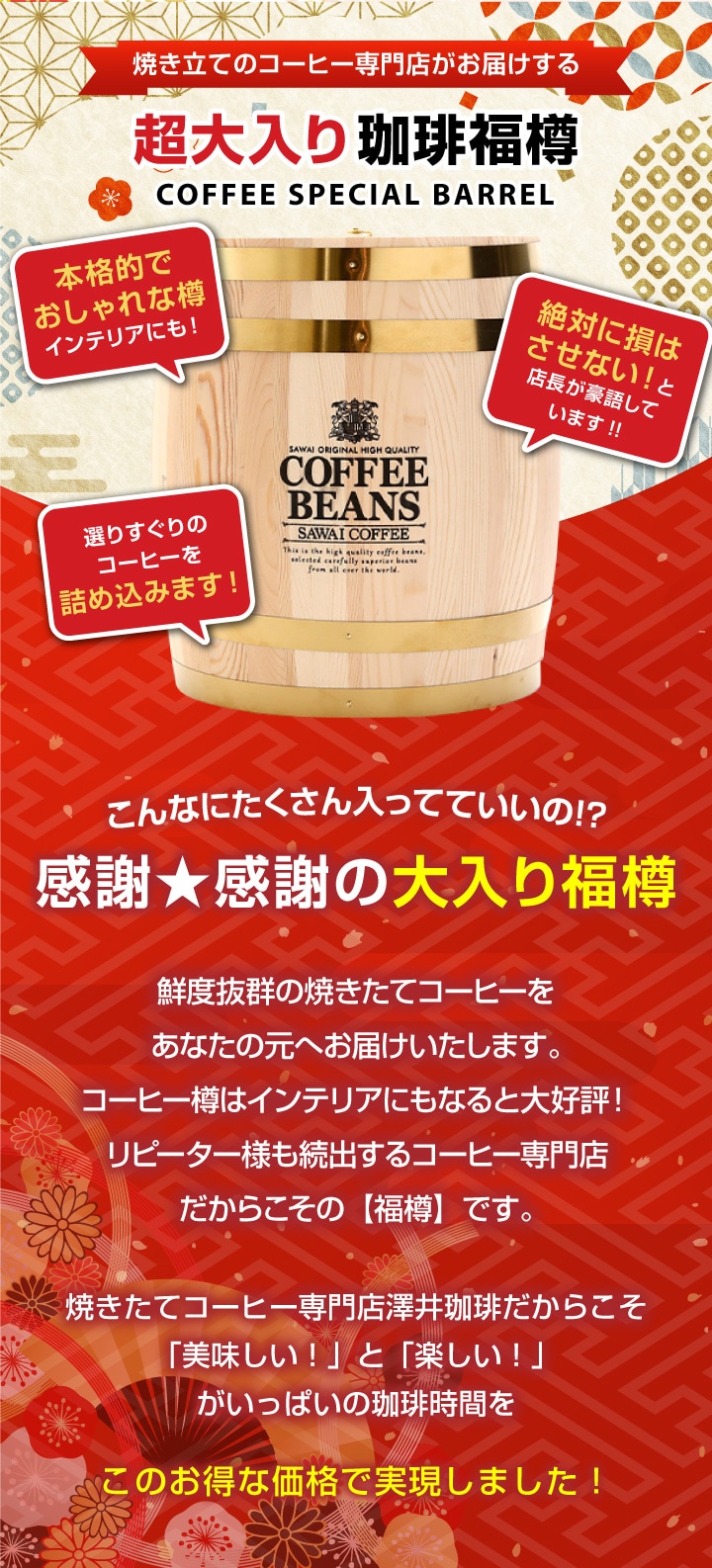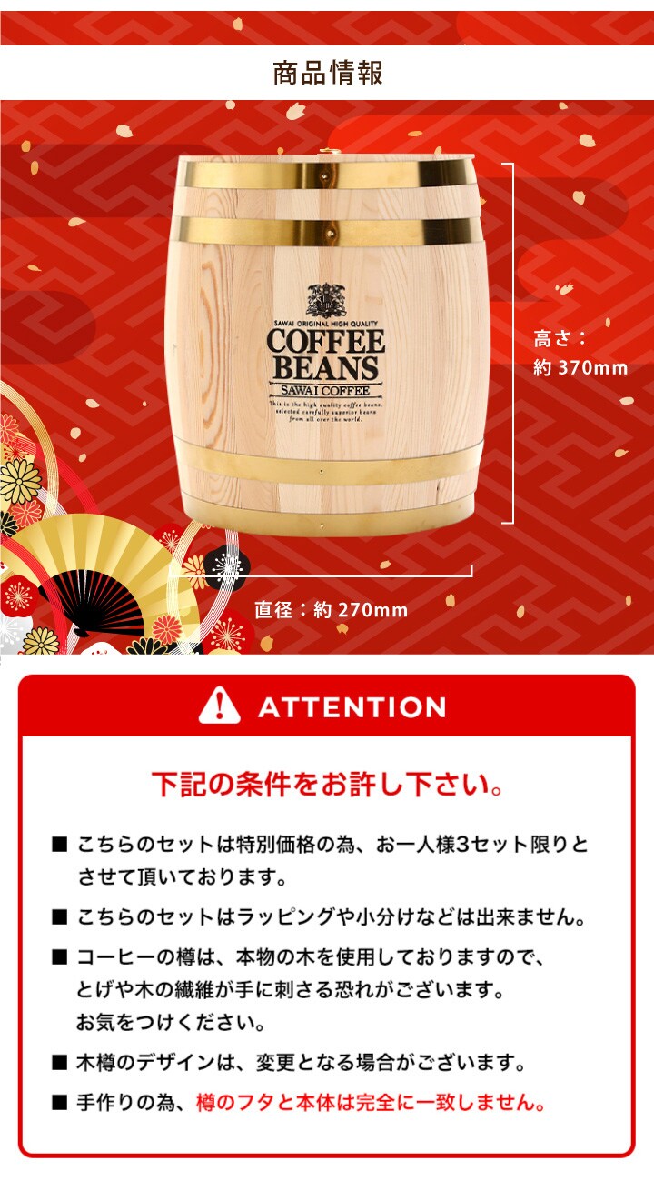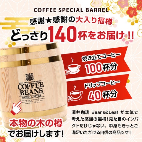 | 商品名 | コーヒー好き必見!澤井珈琲の本格木樽入り140杯分福樽セット |