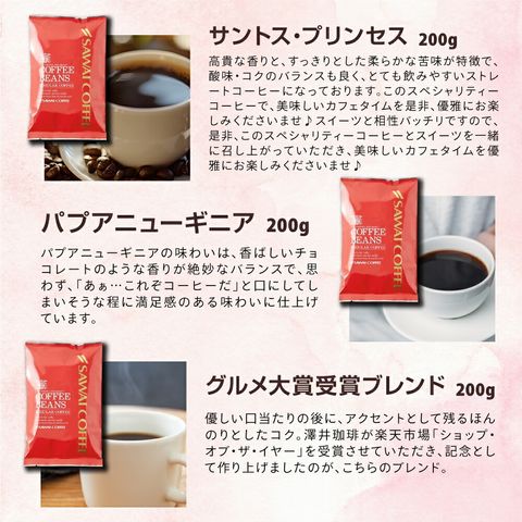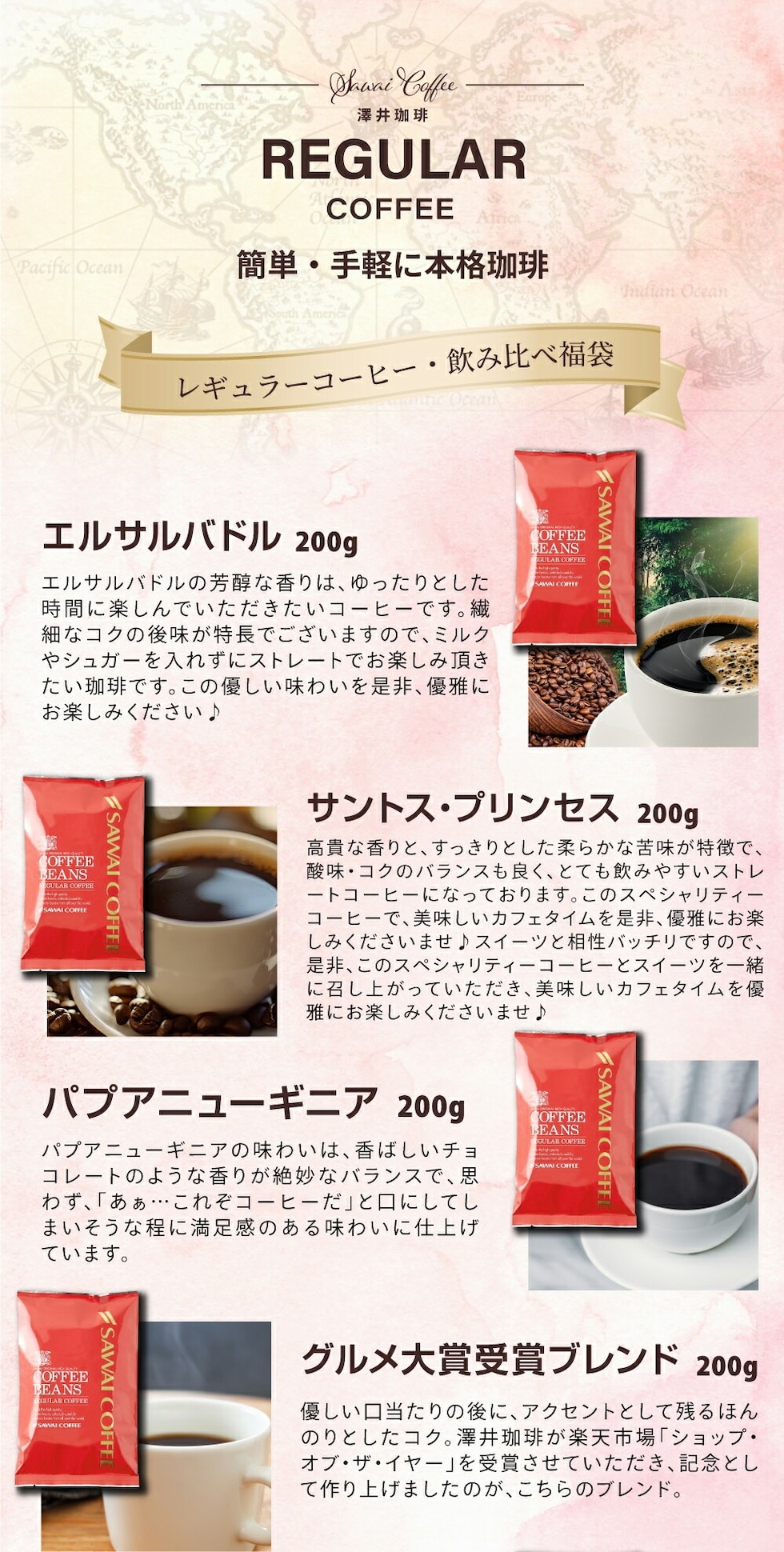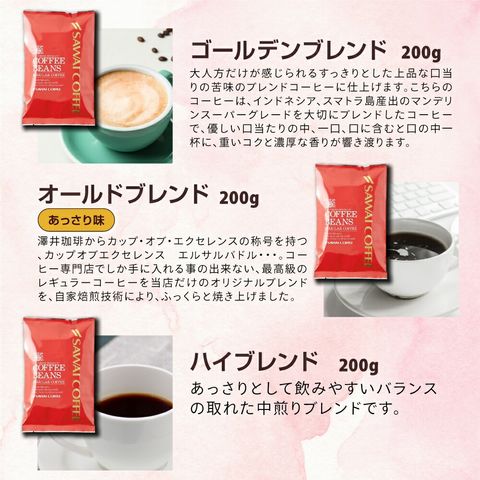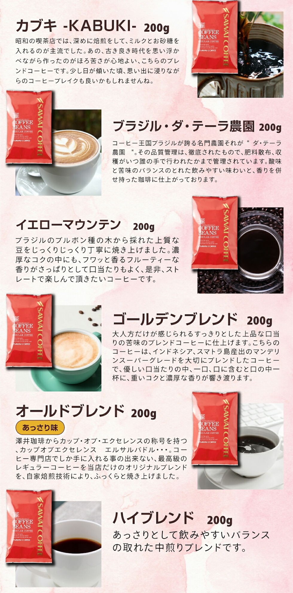 ・エルサルバドル 200g×1袋 ・ブラジル・ダ・テーラ農園 200g×1袋 ・パプアニューギニア 200g×1袋 ・グルメ大賞受賞ブレンド 200g×1袋 ・サントス・プリンセス 200g×1袋 ・オールドブレンド あっさり味 200g×1袋 ・カブキ-KABUKI- 200g×1袋 ・ゴールデンブレンド 200g×1袋 ・イエローマウンテン 200g×1袋 ・ハイブレンド 200g×1袋 |
