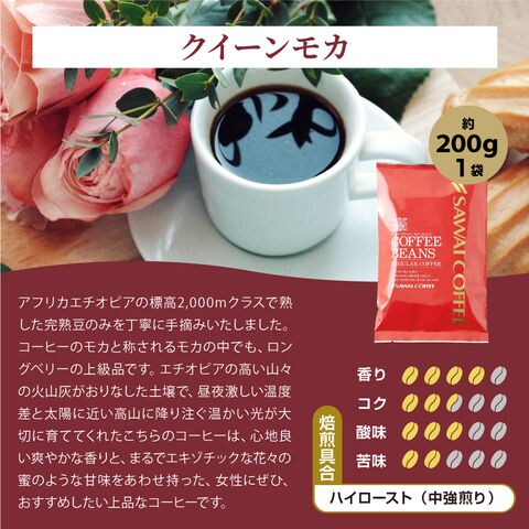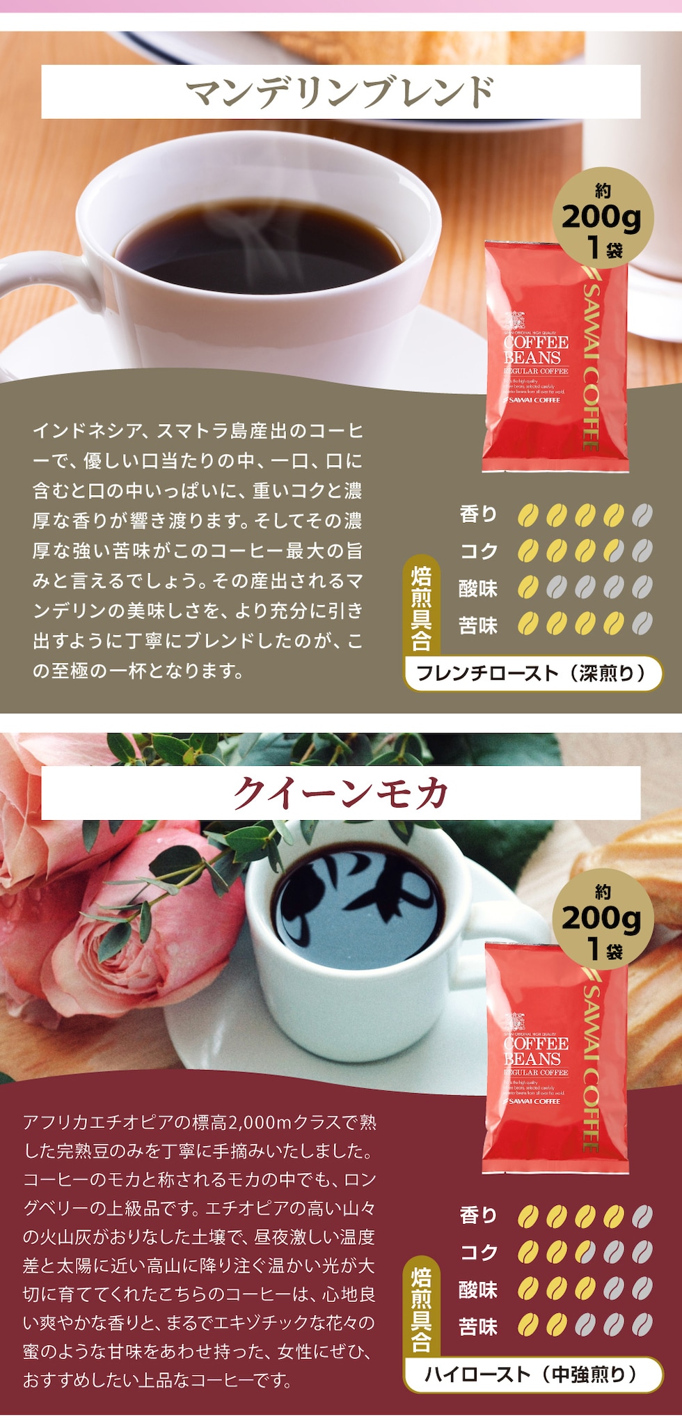 | 内容量 | ・マーガレットプリンセス 200g×1袋 ・マンデリンブレンド 200g×1袋 ・クイーンモカ 200g×1袋 |