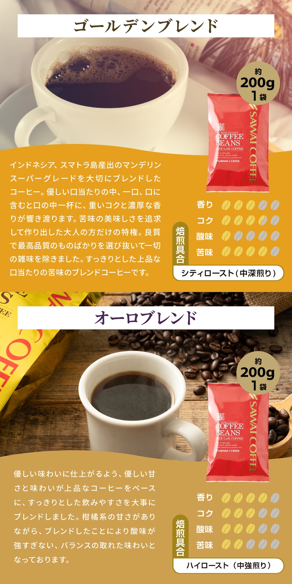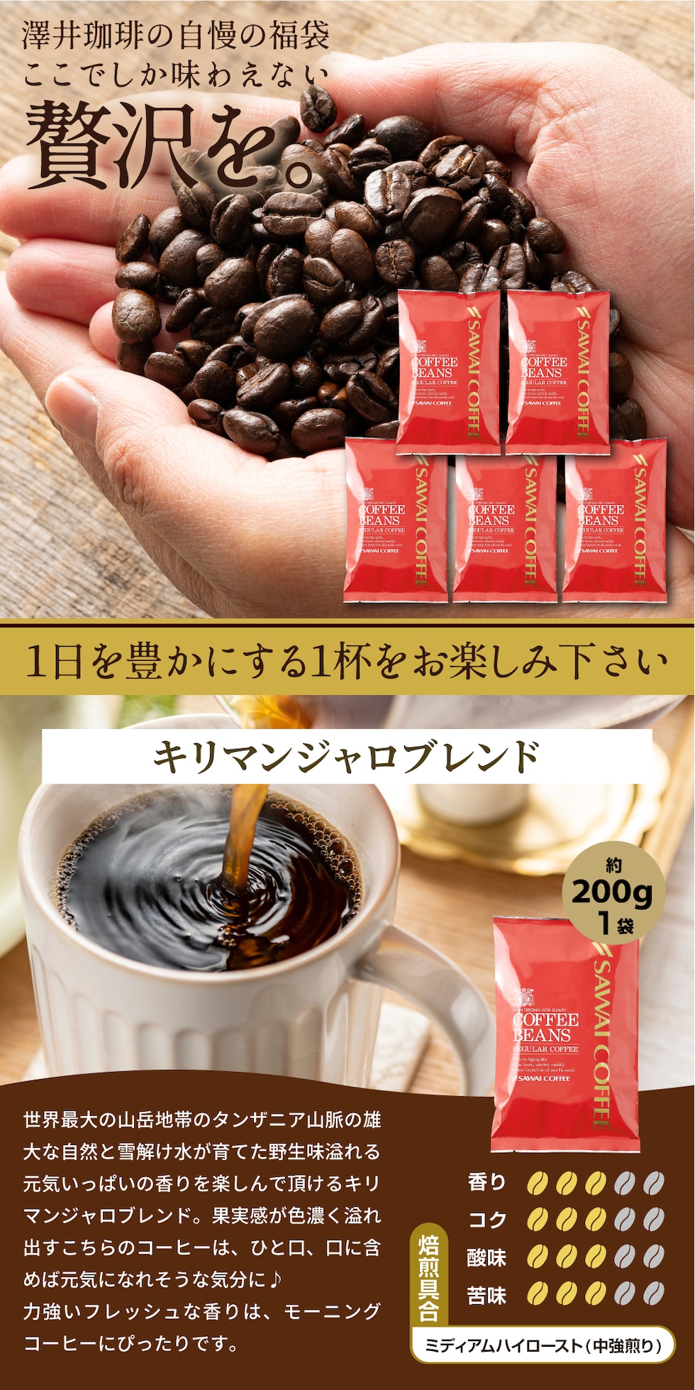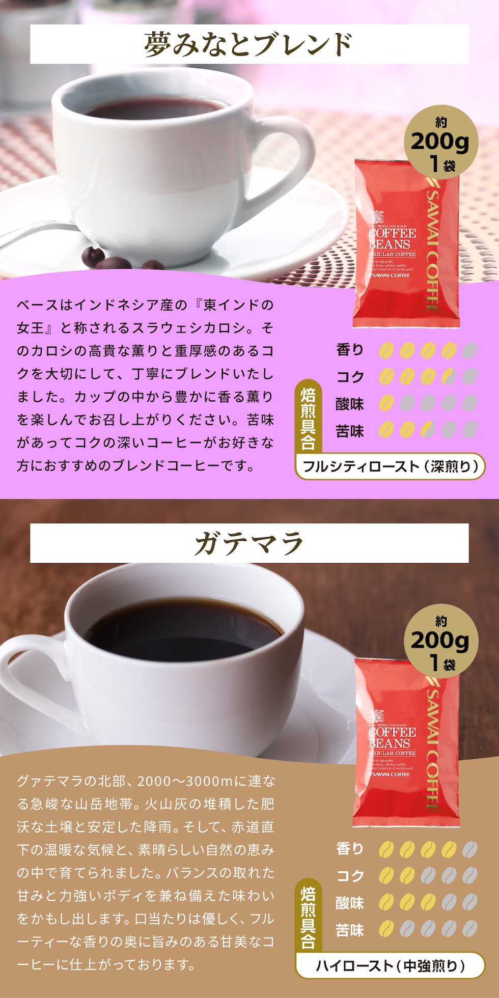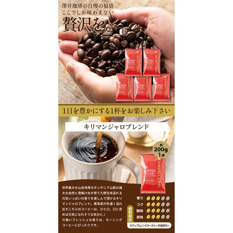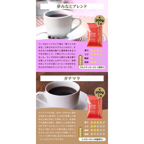 ・キリマンジャロブレンド 200g×1袋 ・夢みなとブレンド 200g×1袋 ・ガテマラ 200g×1袋 ・ゴールデンブレンド 200g×1袋 ・オーロブレンド 200g×1袋 |
