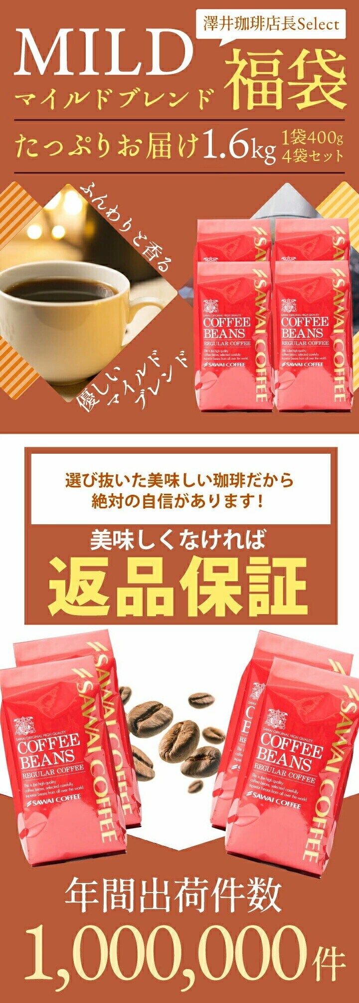 【中挽き】 コーヒー豆 1.6kg 珈琲豆 送料無料 コーヒー 福袋 大容量 400gx4袋 中挽き/豆のまま コーヒー専門店 160杯分 セット マイルドブレンド 澤井珈琲