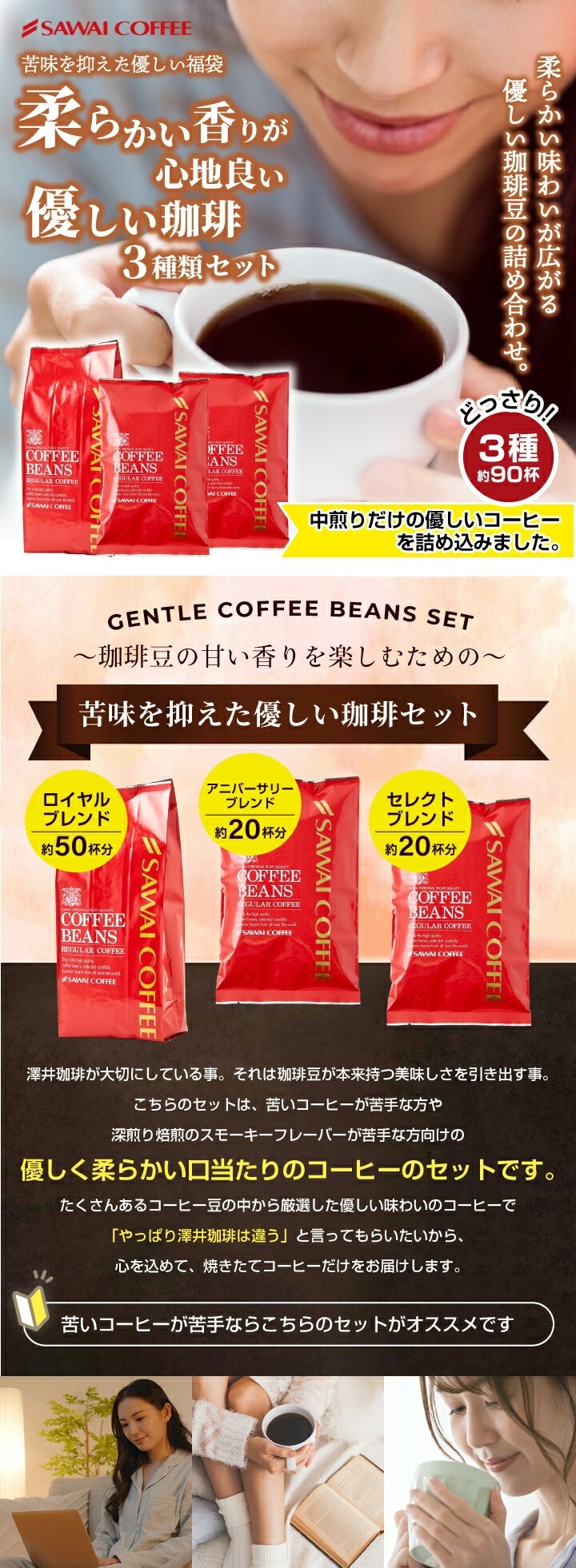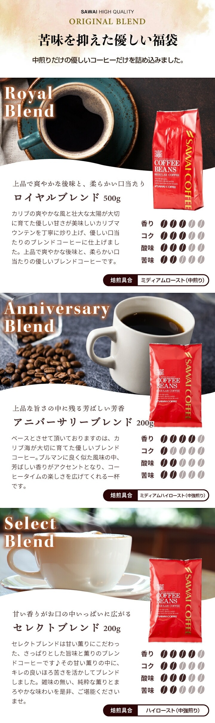 500g×1袋 ・アニバーサリーブレンド 200g×1袋 ・セレクトブレンド 200g×1袋 |