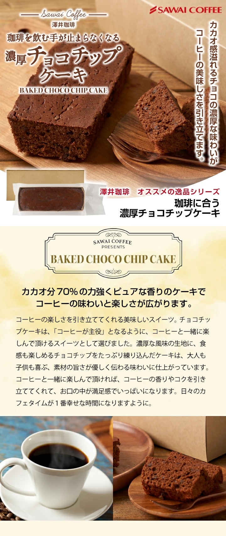 澤井珈琲 濃厚ベイクドチョコチップケーキ 1本 チョコレート カカオ分70% お菓子 洋菓子 スイーツ プチギフト プレゼント ギフト 箱 おしゃれ 誕生日 女性 こだわり素材 コーヒーに合う 澤井スイーツ