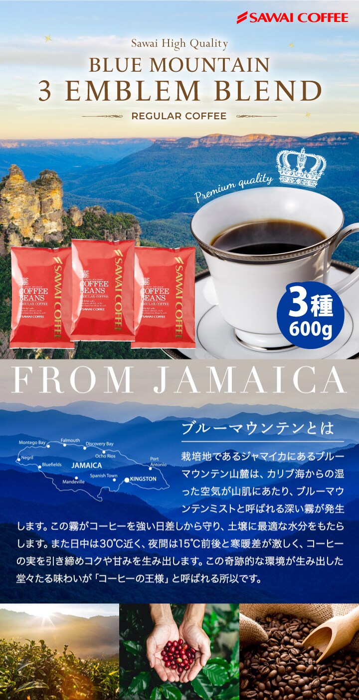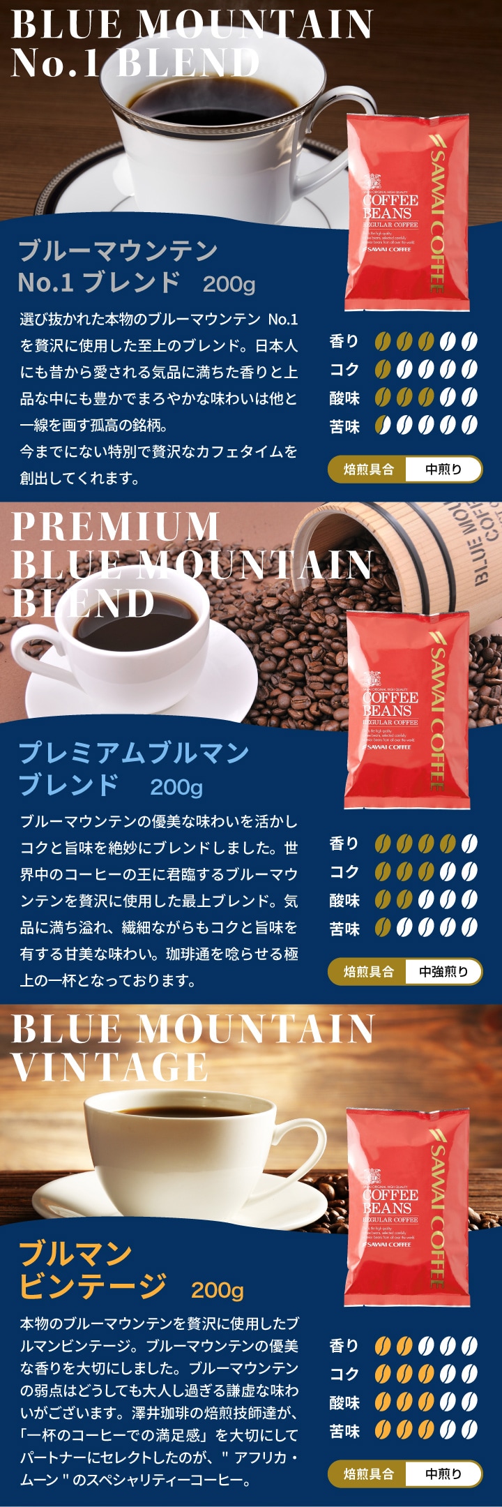 ・ブルーマウンテンNo.1ブレンド 200g×1袋 ・プレミアムブルーマウンテンブレンド 200g×1袋 ・ブルマンビンテージ 200g×1袋 |
