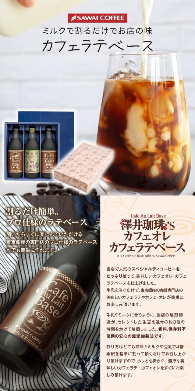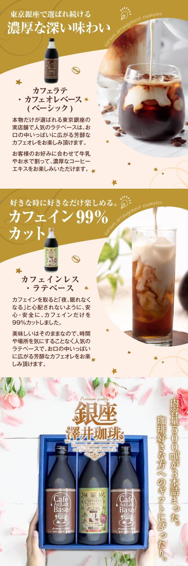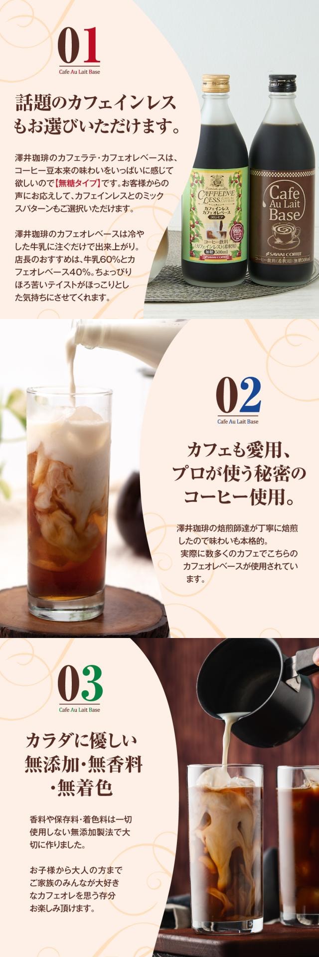 【ベーシック3本】送料無料 コーヒーギフト "牛乳に注ぐだけ!自宅で楽しむプロ仕様カフェオレ" 澤井珈琲 カフェラテベース 500ml×3本 選べる カフェインレス デカフェ ノンカフェイン ギフト