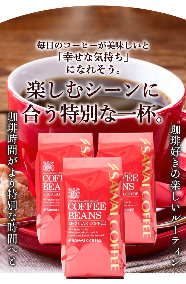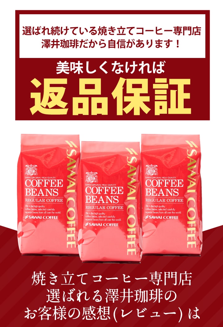 澤井珈琲(さわいこーひー)では、お客様のお家に商品が届き、箱を開けた瞬間。そして、トレードマークの赤いコーヒー袋の封を開けた時に鮮度抜群の「香り高さ」と、飲んだときの「味わい」に感動して頂けるように、レギュラーコーヒーはご注文を頂いてから焙煎をして焼きたてのコーヒー、コーヒー豆、珈琲、珈琲豆をお届けをしている焼き立て珈琲専門店です。お客様に「美味しい」と言って喜んで頂く事が私たちの喜びと思ってます。「美味しいコーヒーをお届けしたい」と想い続けて生まれたこだわりの味を、どうぞ、この機会にお楽しみくださいませ。澤井珈琲では、コーヒー豆は挽き方がご選択いただけます。珈琲豆を挽く事をお楽しみ頂ける『豆のまま』や、私共の専用の特注サイズの大型のミルで挽いて、コーヒー粉の状態にしてお届けする方法がございます。中挽き、細挽き、粗挽き、荒挽きなど様々な挽き方がございますが、私共がお薦めする『店長のおすすめ挽き』にて、そのコーヒーに合った一番美味しいと思える挽き方に挽いてお届けします。東京の銀座にも実店舗を構え、都内では浅草やスカイツリーのあるソラマチにも出店。「鳥取のコーヒー屋さん」とも呼ばれてますが、空気が綺麗で自然豊かな鳥取県に焙煎工場を構え、隣接する島根県の松江市や出雲市にも実店舗がございます。顔の見えないネット通販ですが、全国11店舗を展開する安心安全な澤井珈琲は、特徴的な「赤いコーヒー袋」に入れて、全国の珈琲好きにお選び頂いてます。よく間違えられる名前として、沢井珈琲、沢井コーヒー、澤井珈琲店、澤井珈琲本店、さわいこーひー、サワイコーヒーなどがございますが、正式名称は澤井珈琲となります。