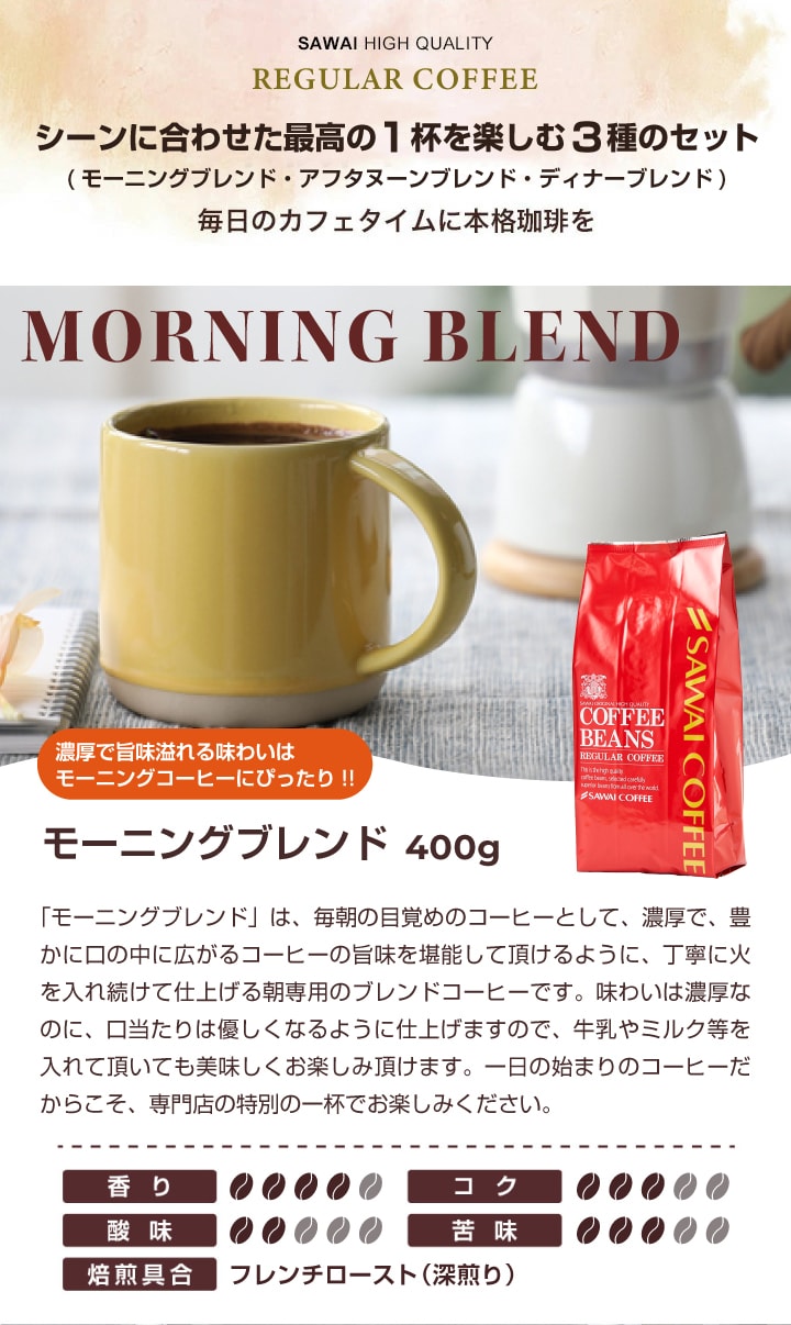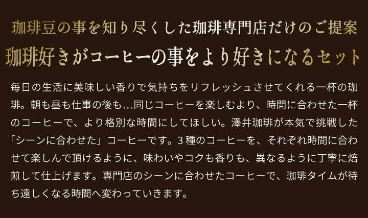 【豆のまま】送料無料 コーヒー コーヒー豆 珈琲豆 "珈琲タイムに合わせて、香りを変える楽しみ" 澤井珈琲 モーニング アフタヌーン ディナー 400g×3袋 飲み比べ セット 朝 昼 夜