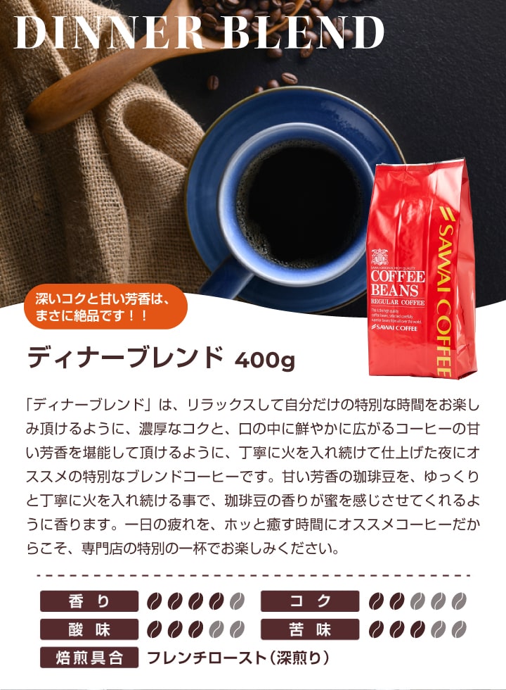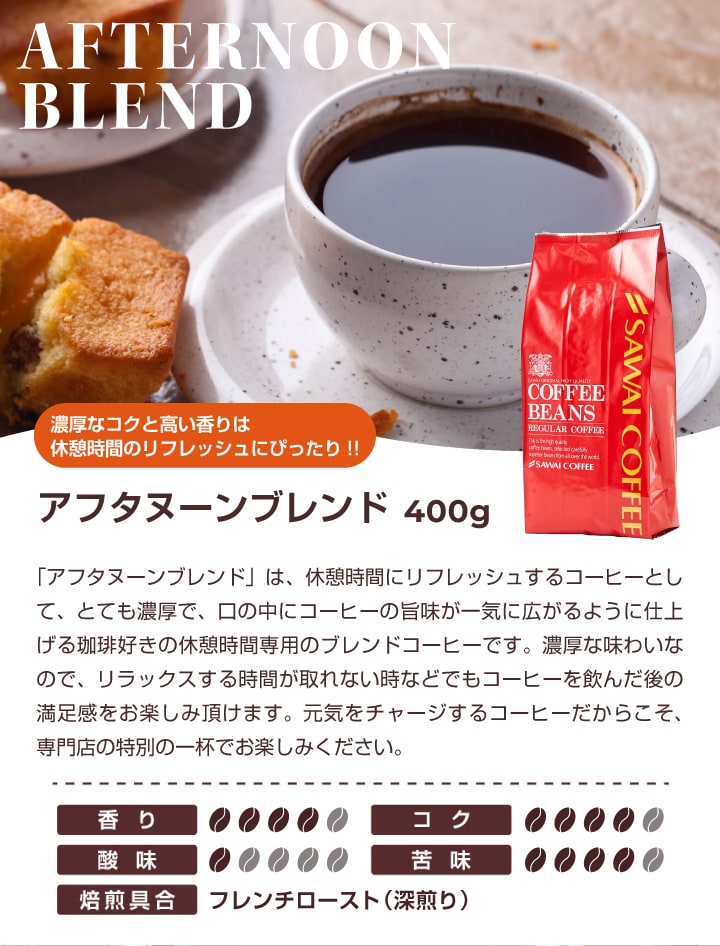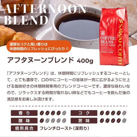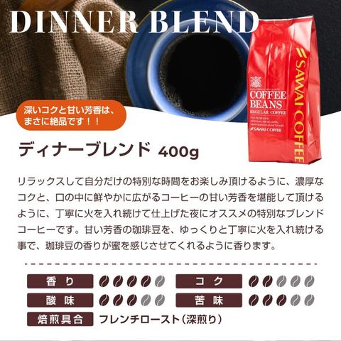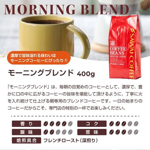 | 内容量 | ・モーニングブレンド 400g×1袋 ・アフタヌーンブレンド 400g×1袋 ・ディナーブレンド 400g×1袋 |