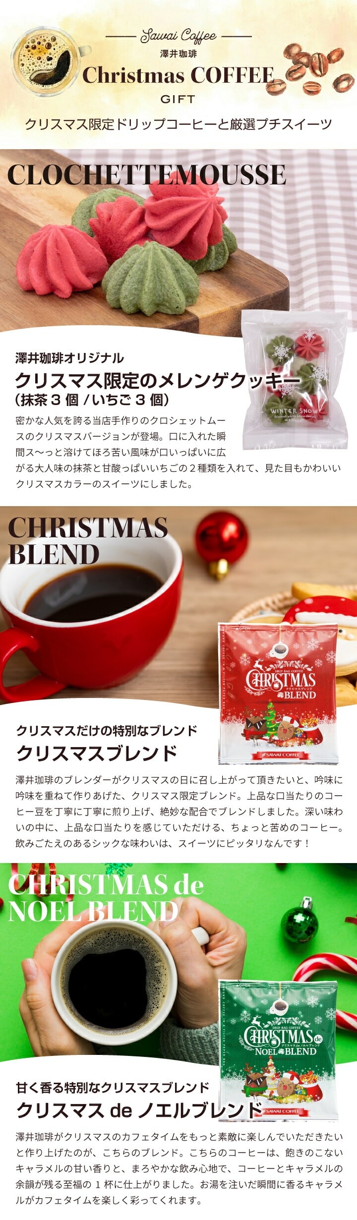 | 澤井珈琲の「クリスマス限定ハッピーバッグギフト ミニサイズ」は、心温まるクリスマスにぴったりの詰め合わせです。特別ブレンドのコーヒー2種類と、カワイイ見た目と本格的な味わいが魅力のメレンゲクッキーがセットに。大切な人へのギフトとして、または自分へのご褒美として、クリスマスに心に残る贈り物を演出します。澤井珈琲ならではのこだわりと品質で、特別なひとときをお届けします。 1. クリスマス限定のブレンドで贅沢なひとときを 「クリスマスブレンド」は深い味わいと上品な苦み、「クリスマスdeノエルブレンド」はキャラメルの甘い香りとまろやかさが特徴です。それぞれが贅沢なカフェタイムを演出し、スイーツとの相性も抜群。心を込めたブレンドがクリスマスを一層特別にしてくれます。 2. 見た目も楽しいメレンゲクッキー 抹茶と苺、2種類のメレンゲクッキーは、サクッとした食感と溶けるような風味が楽しめるスイーツ。クリスマスカラーの可愛い見た目もポイント。特別感を演出するスイーツは贈り物としても自宅用としても大満足です。 3. 季節限定!贈り物にも最適 この季節だけの楽しめるドリップバッグとスイーツのミニギフト。ドリップバッグはお湯を注ぐだけで手軽に本格的な香りと味わいを堪能できるので、自宅でのカフェタイムにぴったりです。季節限定のコーヒーとスイーツで華やかなひと時をどうぞ。 |