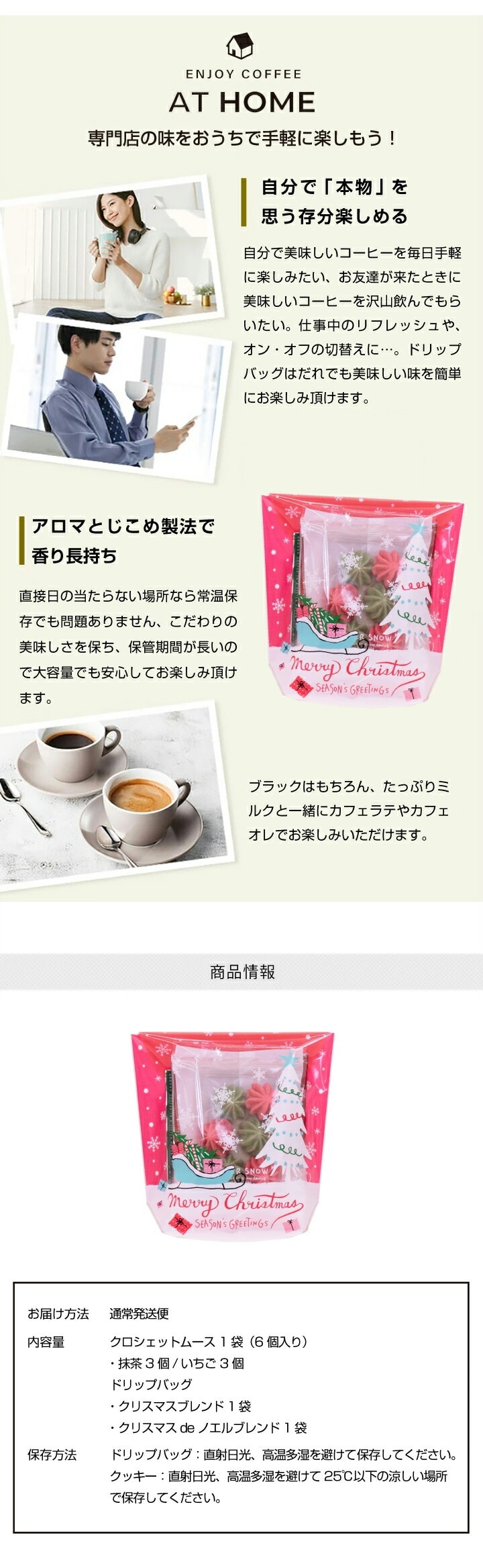| 内容量 | 【ドリップバッグコーヒー】 ・クリスマスブレンド 8g×1袋 ・クリスマス de ノエルブレンド 8g×1袋 【クロシェットムース】 ・1袋(6個入り) 抹茶/3個,いちご/3個 |