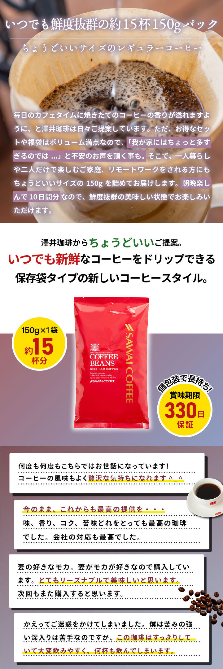 エチオピア産の厳選された豆を使用しており、自宅で簡単に澤井珈琲の40年以上の歴史が支える品質の本格的な味わいを楽しめます。 手軽に飲めるのに質が高いので、コーヒー好きな方におすすめです。また、150gで新鮮な状態を保ちやすいちょうどいいサイズなので、大容量のコーヒーが必要ない方にも最適です。 一人暮らしや二人暮らしのご家庭でも、新鮮な状態で最後まで美味しく飲みきれます。