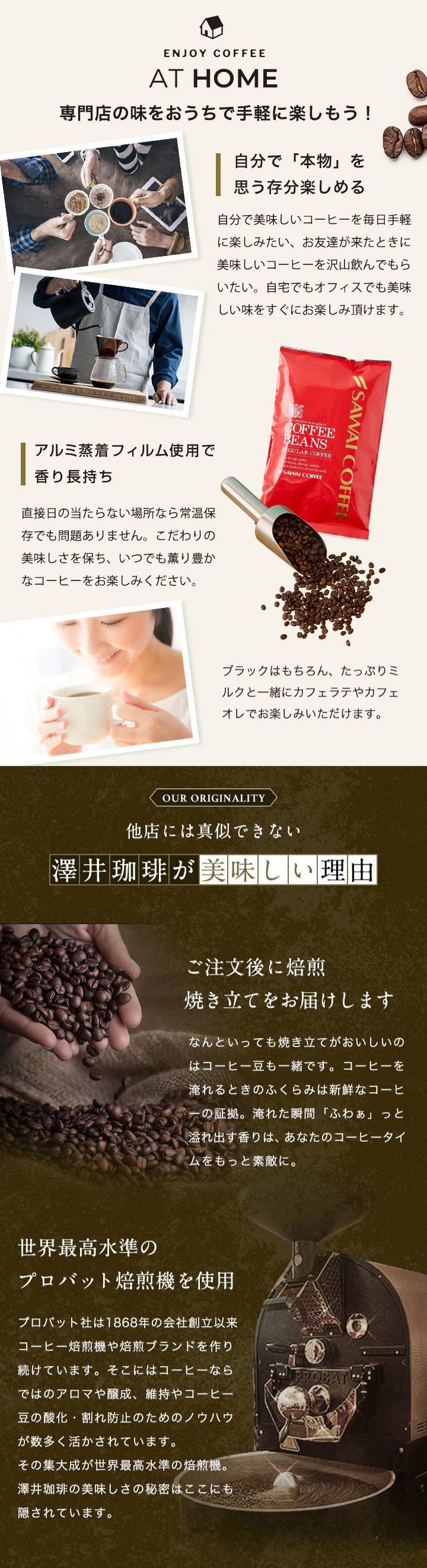 澤井珈琲は40年以上の歴史を持ち、常に高品質のコーヒーを提供しています。 このクラシックモカも例外ではなく、飲むたびに新鮮な香りが広がります。 焙煎したてのコーヒーが手軽に楽しめるので、忙しい朝やリラックスしたい夜にもぴったり。 コーヒーを通して、毎日のちょっとした贅沢なひと時を演出します。