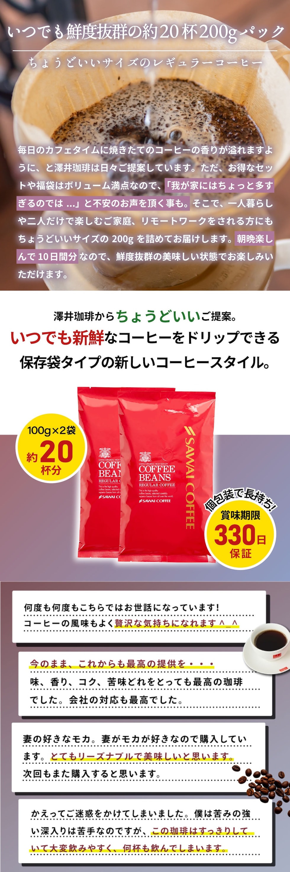 | こんな方にオススメです | 1. 本格的なコーヒーを家庭で楽しみたい人 エチオピア産の厳選された豆を使用しており、自宅で簡単に澤井珈琲の40年以上の歴史が支える品質の本格的な味わいを楽しめます。 手軽に飲めるのに質が高いので、コーヒー好きな方におすすめです。また、100g×2袋で新鮮な状態を保ちやすいちょうどいいサイズなので、大容量のコーヒーが必要ない方にも最適です。 一人暮らしや二人暮らしのご家庭でも、新鮮な状態で最後まで美味しく飲みきれます。 2. リモートワークや在宅勤務中にリフレッシュしたい人 自宅での仕事が多い方におすすめです。淹れたてのコーヒーの香りで、気分転換や集中力アップをサポートします。手軽に20杯分楽しめるので、無理なく毎日続けられます。 |