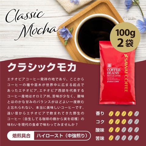 | このクラシックモカは、エチオピア発祥の伝統的なモカコーヒーの味わいを楽しめる商品です。