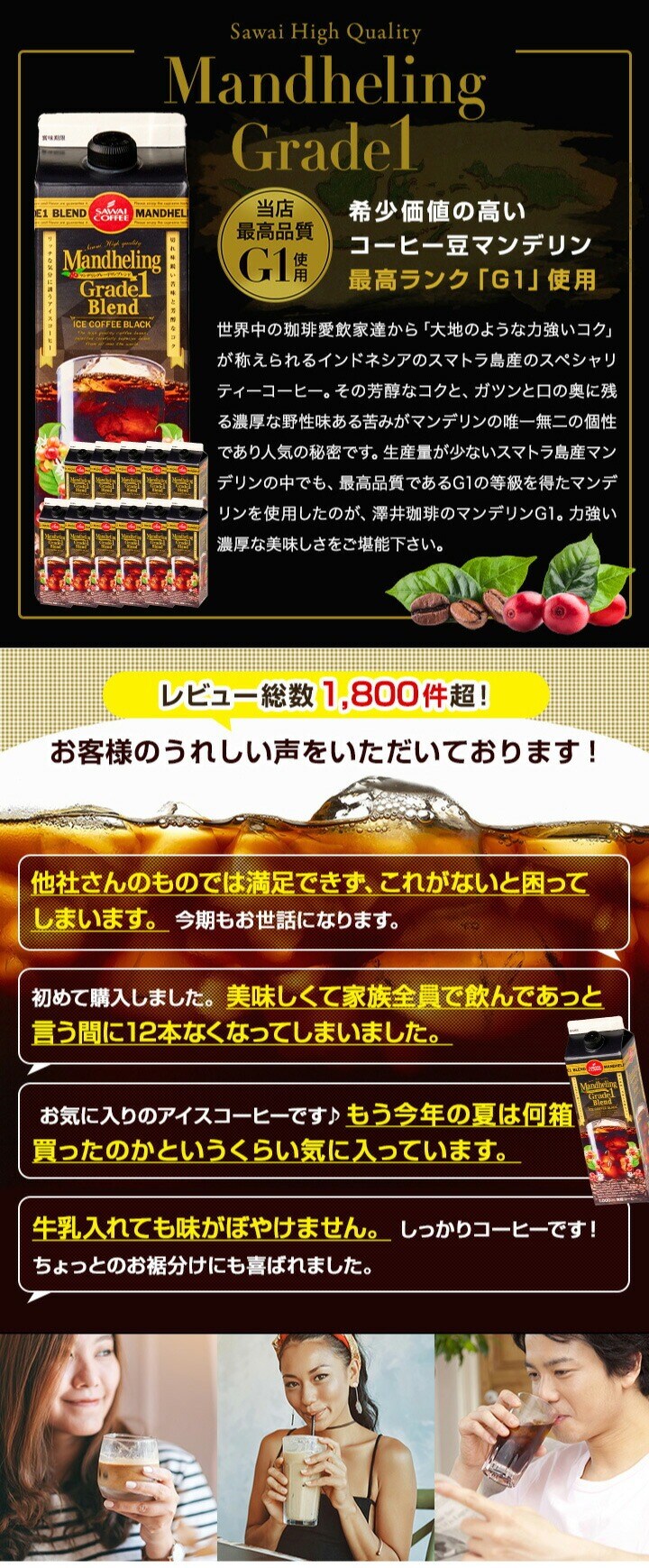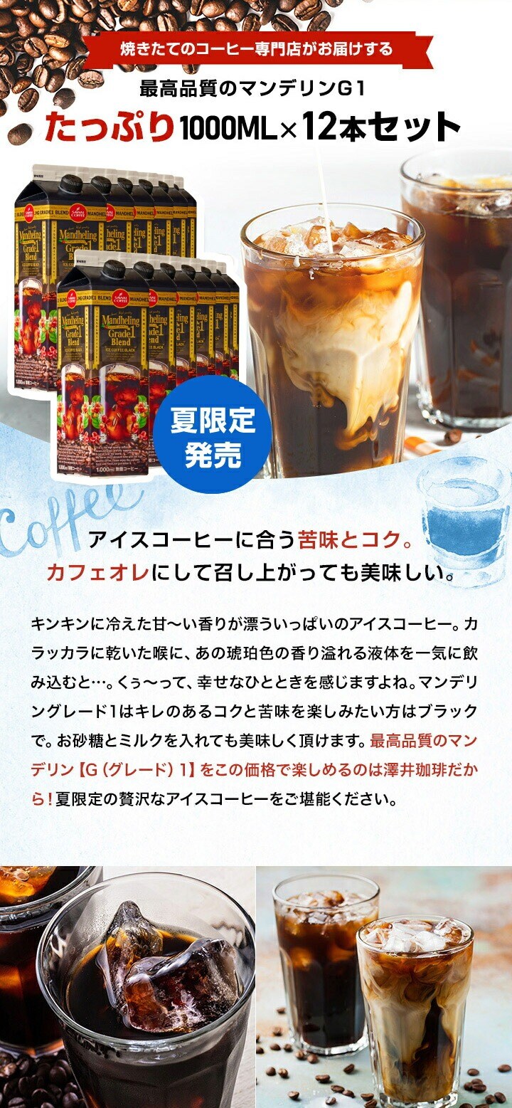 | 商品名 | 澤井珈琲 濃厚なコクと苦味のマンデリン グレードワン リキッドアイスコーヒー 無糖 1000ml 12本セット |