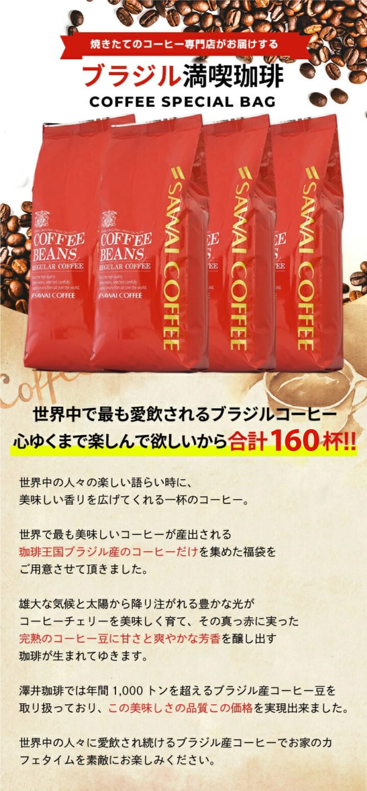 【豆のまま】焙煎したて コーヒー豆 1.6kg 珈琲豆 送料無料 コーヒー 福袋 大容量 400g×4袋 コーヒー専門店 160杯分 飲み比べ セット ブラジル スペシャルブレンド 澤井珈琲