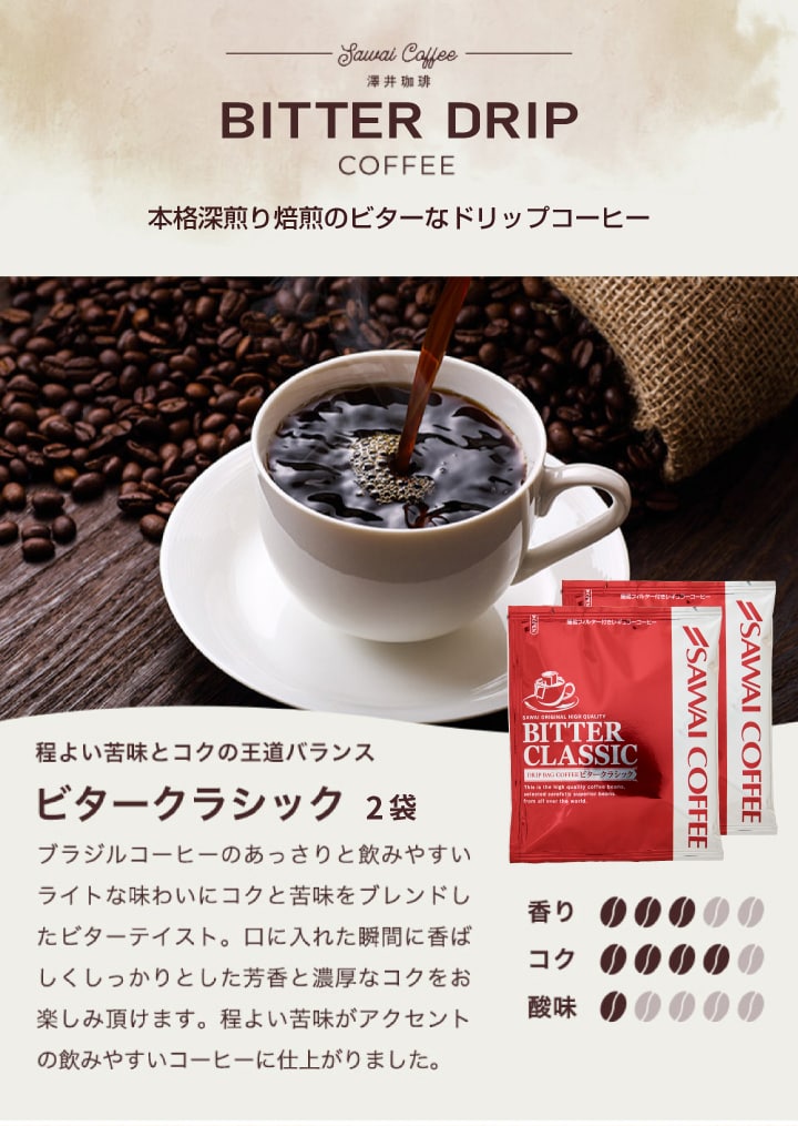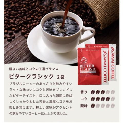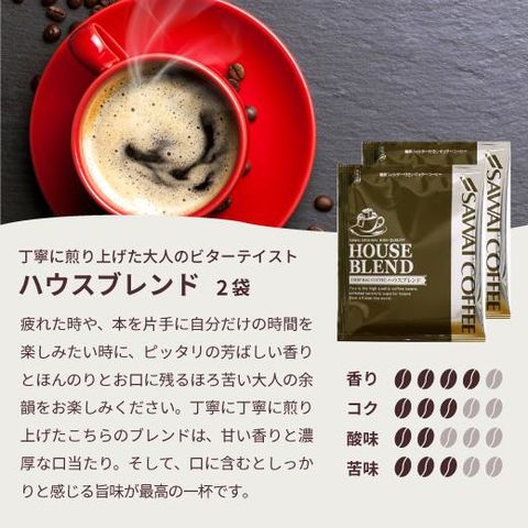 | 内容量 | ・ビタークラシック 7g×2袋 ・ビターゴールド 7g×2袋 ・ハウスブレンド 7g×2袋 ・ビジネスブレンド 7g×2袋 ・オフィスブレンド 7g×2袋 |
