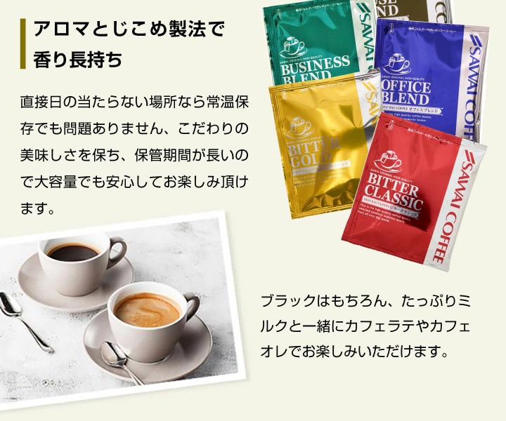 | 産地 | 【ビタークラシック】ブラジル、インドネシア 【ビターゴールド】ブラジル、ガテマラ 【ハウスブレンド】ブラジル、エチオピア他 【ビジネスブレンド】 ブラジル、エチオピア他 【オフィスブレンド】ブラジル、インドネシア他 |