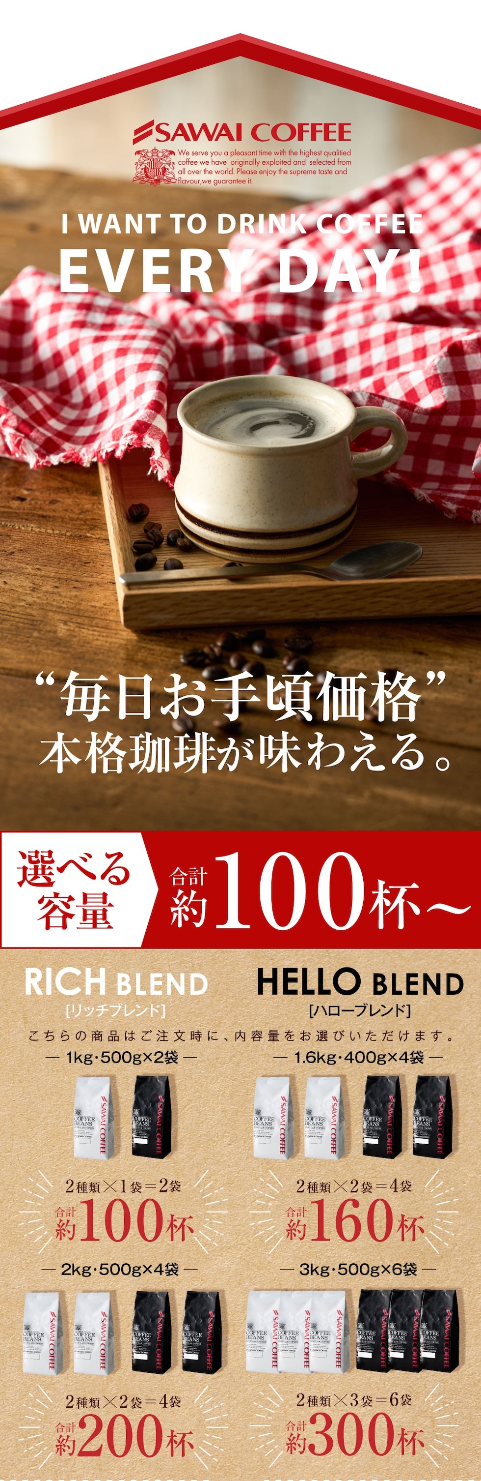 | 内容量 | 【400g×4袋(約160杯分)】 ・リッチブレンド 400g×2袋 ・ハローブレンド 400g×2袋 |