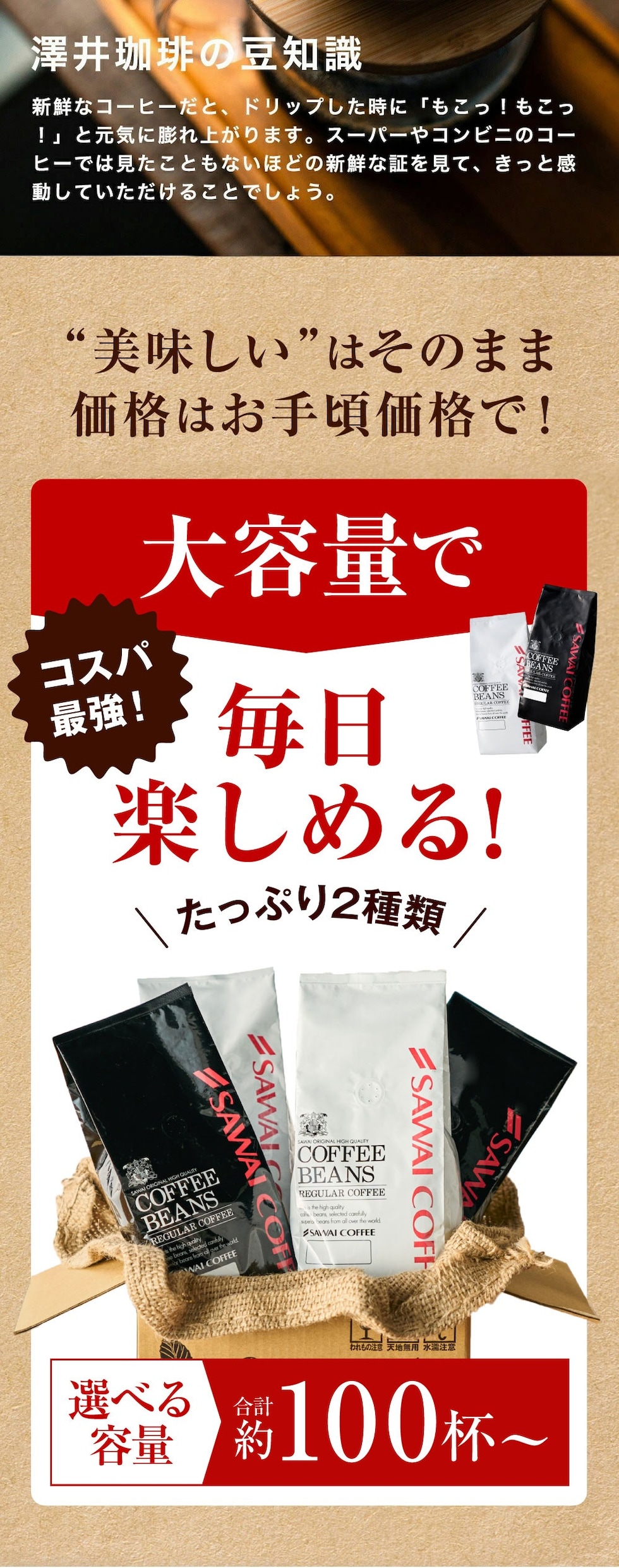 | この「白と黒のコーヒー福袋」は濃厚な味わいが魅力の「リッチブレンド」と、爽やかな後味が楽しめる「ハローブレンド」、2種類のブレンドを詰め合わせたお得なセット商品です。ミルクとの相性が抜群でカフェオレにもぴったりなリッチブレンドと、すっきり飲みやすく毎日の一杯に最適なハローブレンド。焙煎したての香りと鮮度にもこだわり、プロの焙煎士が丁寧に焼き上げた本格コーヒーをお手頃価格でお届けします。ご家庭で贅沢なカフェ気分をお楽しみください。 1. 香り豊かな2種の本格ブレンドセット 濃厚でコク深い「リッチブレンド」と、すっきり爽やかな「ハローブレンド」の2種類を詰め合わせたセットです。リッチブレンドはミルクと相性抜群でカフェオレにも最適、ハローブレンドは軽やかな口当たりで朝の一杯にぴったり。どちらも焙煎士が丁寧に焼き上げた本格派で、気分に合わせて味わいを選べるのが魅力。毎日のコーヒータイムを贅沢に演出する、香りと鮮度にこだわったおすすめのセットです。 2. 香りと鮮度にこだわった焙煎 澤井珈琲は、焼きたての芳醇な香りと鮮度を最大限に楽しんでいただくために、焙煎技師が心を込めて焼き上げたコーヒー豆を提供しております。新鮮なコーヒーは、お湯を注いだ瞬間に膨れ上がり、その香りと味わいは他の追随を許しません。お家でカフェ気分を味わえる、最高の一杯をお届けします。 3. ライフスタイルに合わせて選べる「100杯・160杯・200杯・300杯」 この福袋は、お客様のライフスタイルや用途に合わせて「100杯・160杯・200杯・300杯」からお好きな数量を選べる仕様です。毎日たっぷり楽しみたい方も、まずは試してみたい方も、自分にぴったりの量を選べるのが魅力。ご自宅用はもちろん、家族や友人とシェアしたり、会社でのストック用やプレゼントとしても最適です。香り豊かな珈琲を、お好みの量で存分にお楽しみください。 |