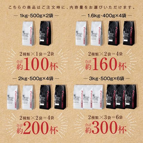 | この「白と黒のコーヒー福袋」は濃厚な味わいが魅力の「リッチブレンド」と、爽やかな後味が楽しめる「ハローブレンド」、2種類のブレンドを詰め合わせたお得なセット商品です。ミルクとの相性が抜群でカフェオレにもぴったりなリッチブレンドと、すっきり飲みやすく毎日の一杯に最適なハローブレンド。焙煎したての香りと鮮度にもこだわり、プロの焙煎士が丁寧に焼き上げた本格コーヒーをお手頃価格でお届けします。ご家庭で贅沢なカフェ気分をお楽しみください。 1. 香り豊かな2種の本格ブレンドセット 濃厚でコク深い「リッチブレンド」と、すっきり爽やかな「ハローブレンド」の2種類を詰め合わせたセットです。リッチブレンドはミルクと相性抜群でカフェオレにも最適、ハローブレンドは軽やかな口当たりで朝の一杯にぴったり。どちらも焙煎士が丁寧に焼き上げた本格派で、気分に合わせて味わいを選べるのが魅力。毎日のコーヒータイムを贅沢に演出する、香りと鮮度にこだわったおすすめのセットです。 2. 香りと鮮度にこだわった焙煎 澤井珈琲は、焼きたての芳醇な香りと鮮度を最大限に楽しんでいただくために、焙煎技師が心を込めて焼き上げたコーヒー豆を提供しております。新鮮なコーヒーは、お湯を注いだ瞬間に膨れ上がり、その香りと味わいは他の追随を許しません。お家でカフェ気分を味わえる、最高の一杯をお届けします。 3. ライフスタイルに合わせて選べる「100杯・160杯・200杯・300杯」 この福袋は、お客様のライフスタイルや用途に合わせて「100杯・160杯・200杯・300杯」からお好きな数量を選べる仕様です。毎日たっぷり楽しみたい方も、まずは試してみたい方も、自分にぴったりの量を選べるのが魅力。ご自宅用はもちろん、家族や友人とシェアしたり、会社でのストック用やプレゼントとしても最適です。香り豊かな珈琲を、お好みの量で存分にお楽しみください。 |