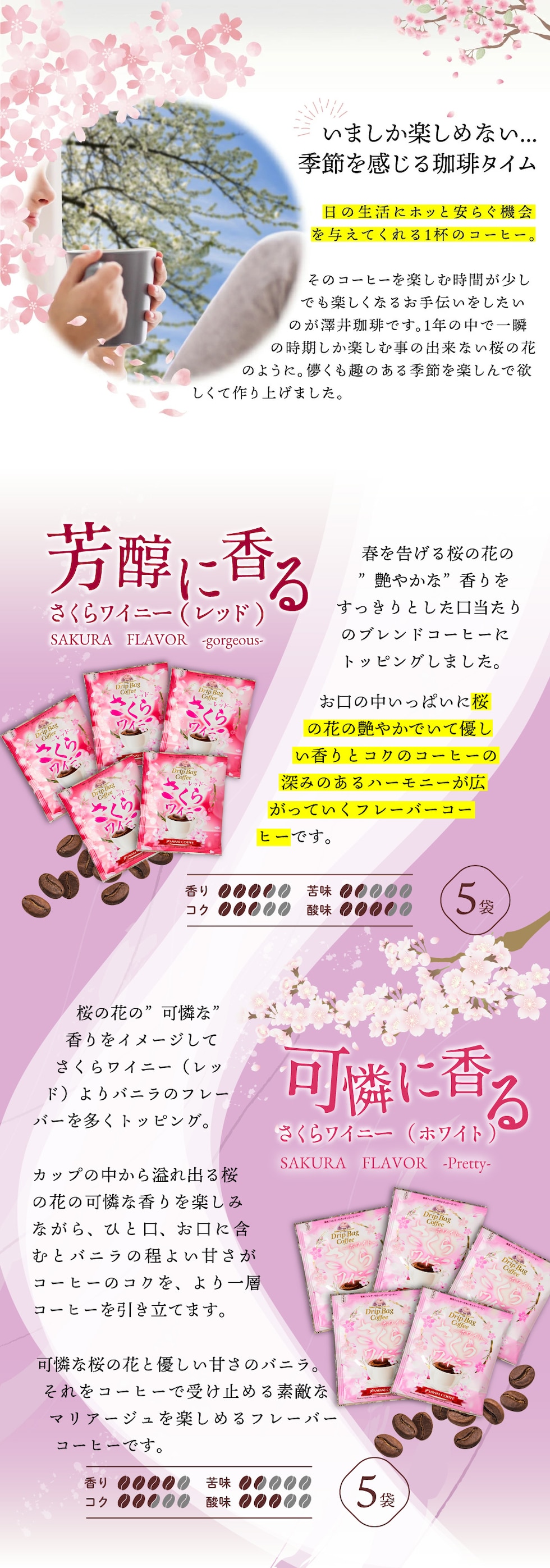 | 商品名 | 春限定 桜の香りのフレーバーコーヒー さくらワイニー5袋 |
