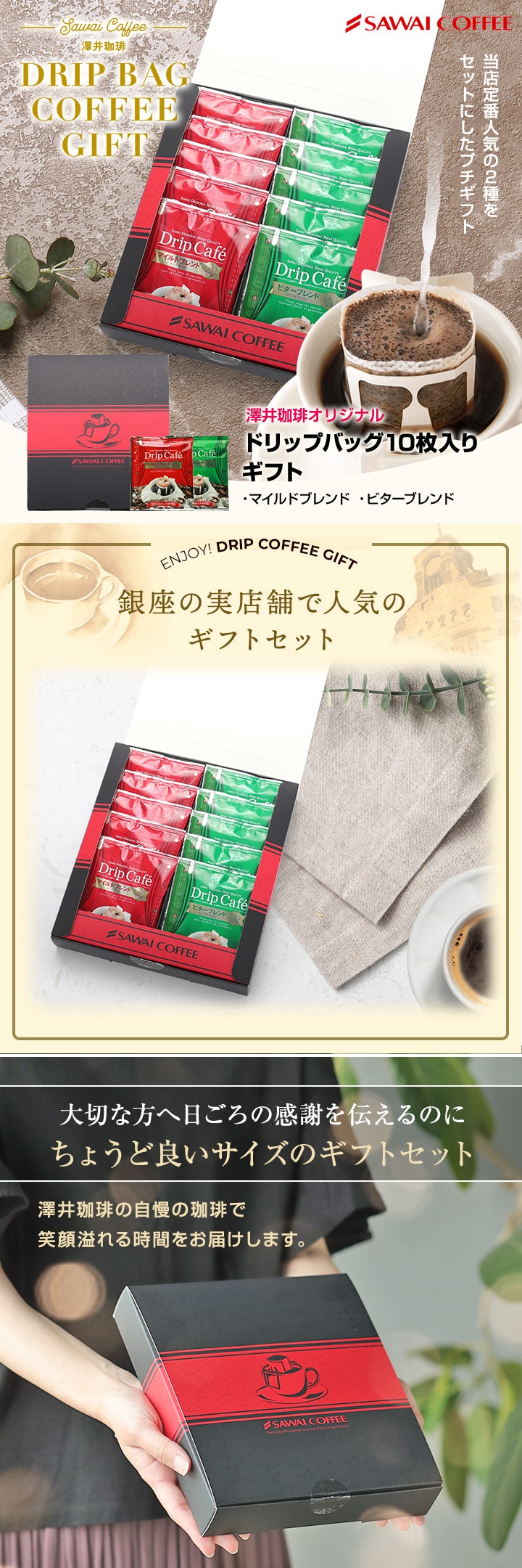 送料無料 ドリップバッグ コーヒー 珈琲 コーヒーギフト "内祝い・お返し・お祝い最適なドリップパック ギフト" 澤井珈琲 ドリップコーヒー マイルド ビター 2種 10袋 喜ばれる 包装 手提げ袋 ギフト