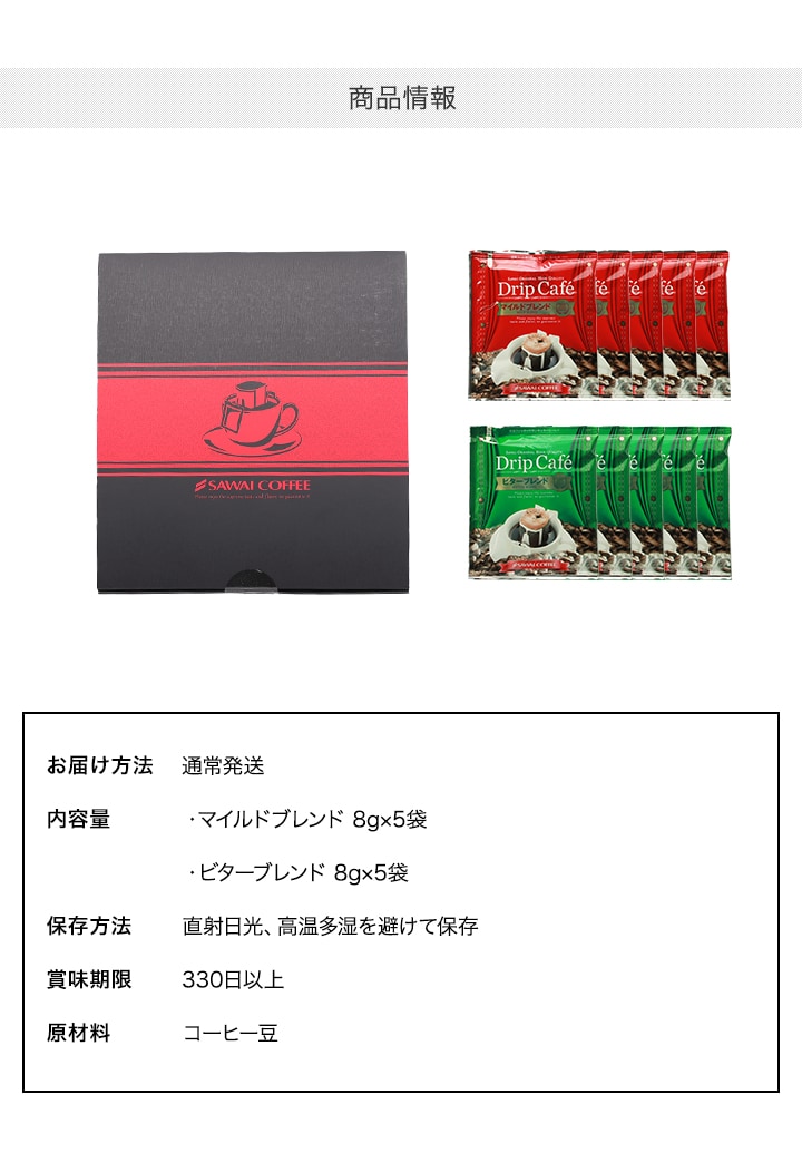 | 商品名 | ドリップバッグコーヒーギフト 10袋入り マイルド ビターブレンド 人気2種 |