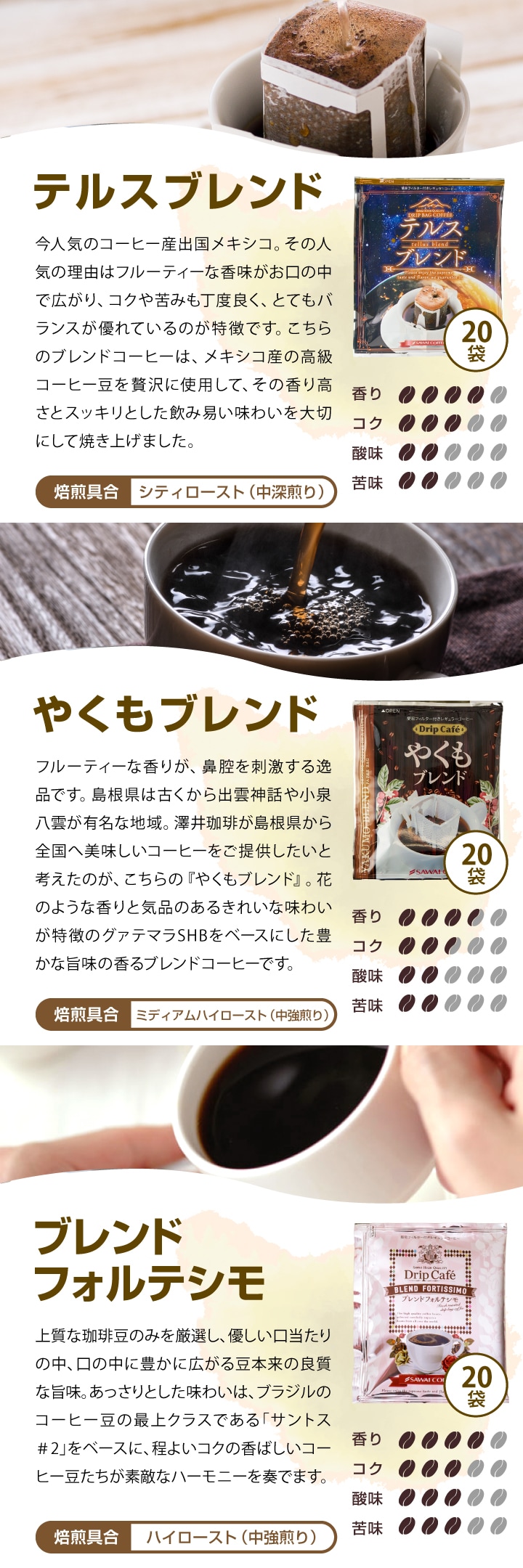 | 内容量 | ・テルスブレンド 8g×20袋 ・やくもブレンド 8g×20袋 ・ブレンドフォルテシモ 8g×20袋 |