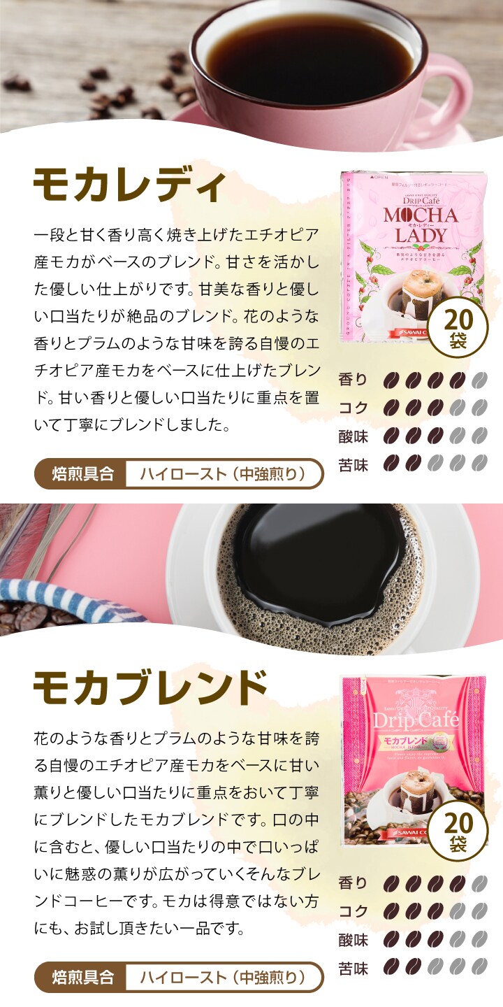 | 内容量 | ・モカレディ 8g×20袋 ・モカブレンド 8g×20袋 ・濃い味ブレンド 8g×20袋 |