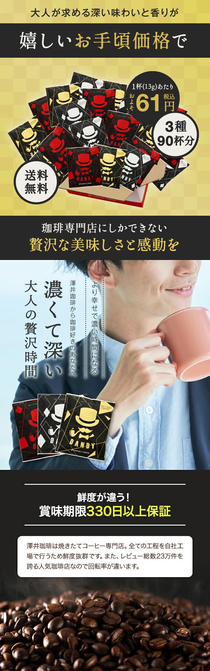 | 内容量 | ●ドリップバッグコーヒー ・DANDY【赤】 13g×30袋 ・DANDY【金】 13g×30袋 ・DANDY【銀】 13g×30袋 |