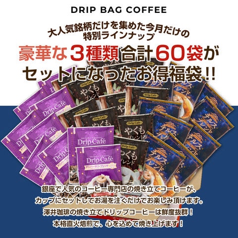 鮮度抜群 ドリップコーヒー 珈琲 ドリップパック 送料無料 コーヒー 福袋 ドリップバッグ 20袋×3種 個包装 飲み比べ セット アニバーサリーブレンド やくもブレンド テルスブレンド 12月のおすすめドリップバッグ福袋 60杯分 澤井珈琲