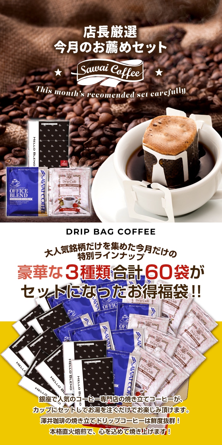 鮮度抜群 ドリップコーヒー 珈琲 ドリップパック 送料無料 コーヒー 福袋 ドリップバッグ 20袋×3種 個包装 飲み比べ セット 2月のおすすめドリップバッグ福袋 60杯分 澤井珈琲