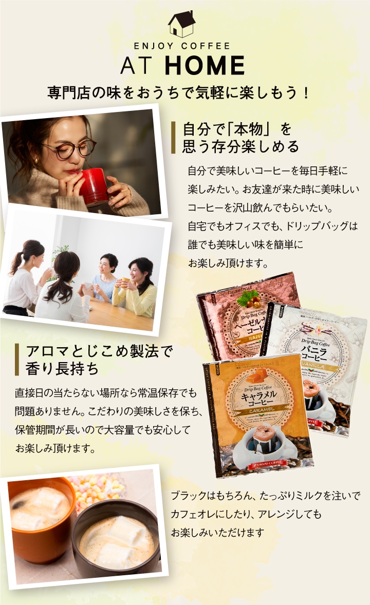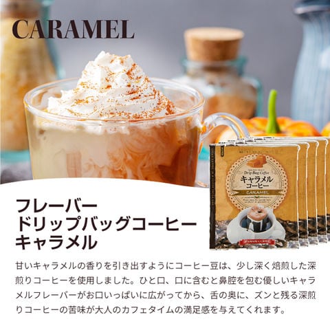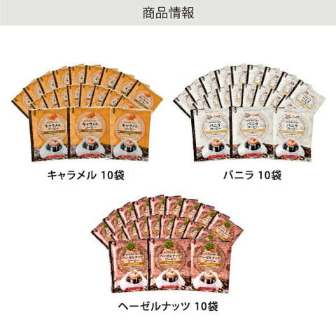 | 内容量 | ●ドリップバッグコーヒー ・キャラメル 8g×10袋 ・バニラ 8g×10袋 ・ヘーゼルナッツ 8g×10袋 |