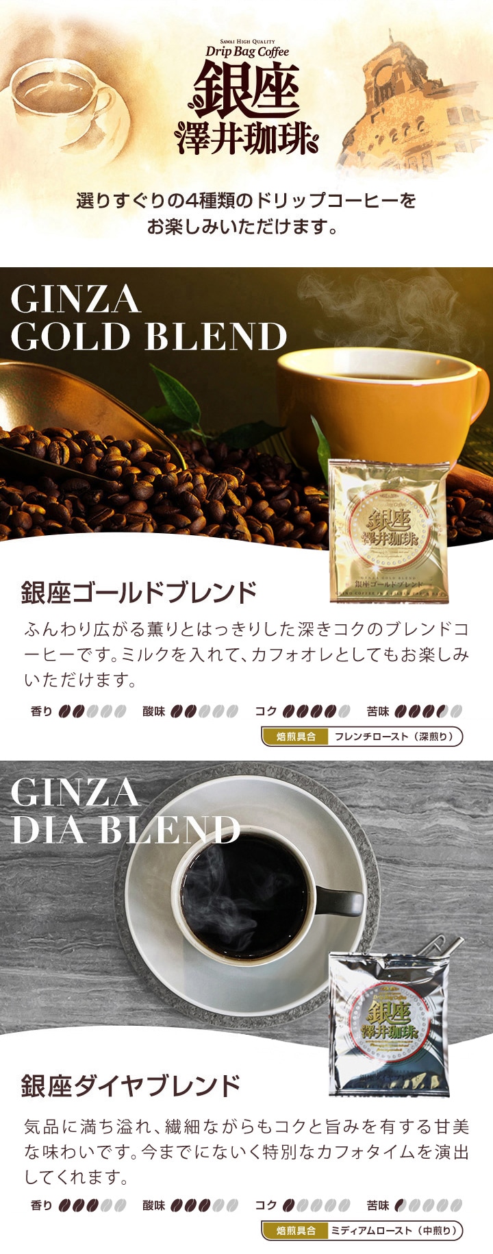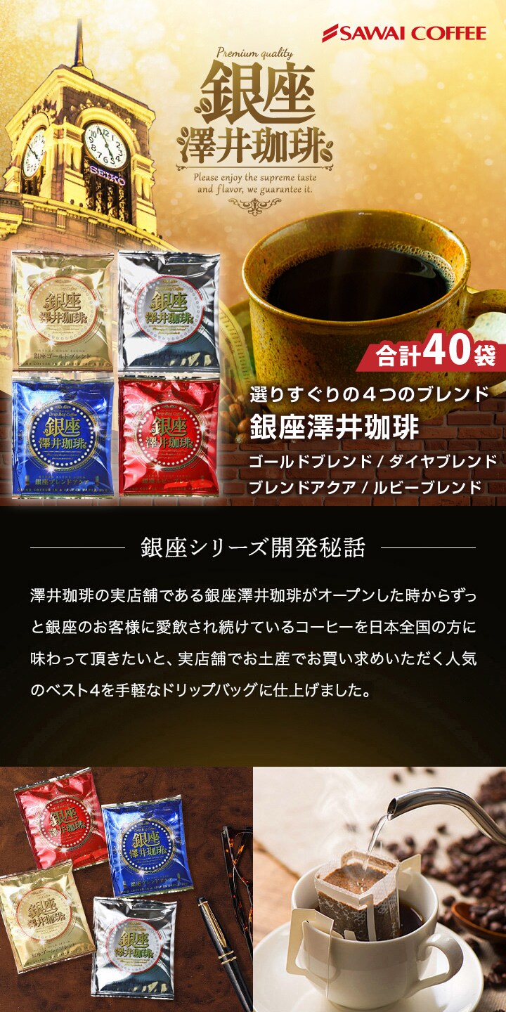 送料無料 ドリップバッグ コーヒー 珈琲 "銀座で愛される人気ドリップ4種が楽しめる" 澤井珈琲 銀座澤井珈琲 ゴールド/ダイヤ/アクア/ルビー 40袋 大容量 セット 福袋 個包装 ギフト