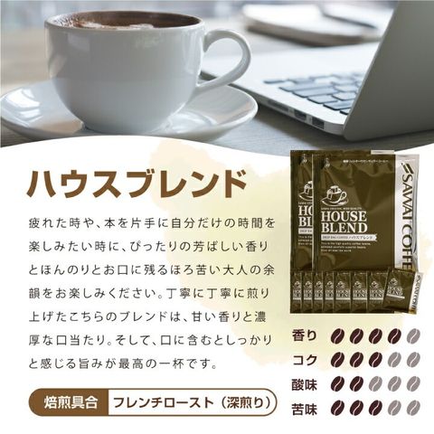 | 澤井珈琲の特製ブレンドコーヒーは、2倍の時間をかけて丁寧に焙煎した深煎りコーヒーです。ブラジルやインドネシアなどの高級豆を使い、濃厚で香ばしい味わいが特徴。オフィスや家でのリラックスタイムにぴったりです。 1. 丁寧に丁寧に煎り上げた大人のビターテイスト ハウスブレンド こちらのブレンドは、甘い香りと濃厚な口当たり。そして、口に含むとしっかりと感じる旨みが最高の一杯です。 2. 大事な取引先や来客にお出しするコーヒー オフィスブレンド ブラジルのコーヒー豆の最上クラスである「サントスNo.2」をベースに、程よいコクの香ばしいコーヒー豆たちが素敵なハーモニーを奏でてくれます。 3. 毎日の忙しい仕事の合間に一息…そんな時に気分を持ち上げてくれる ビジネスブレンド ブラジル産、コロンビア産、インドネシア産の高級コーヒー豆を贅沢に使用して、オフィスの仲間の皆様やお客様に、「美味しい!」と笑顔になってもらえる自信があります。 |