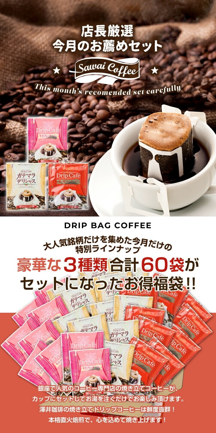 鮮度抜群 ドリップコーヒー 珈琲 ドリップパック 送料無料 コーヒー 福袋 ドリップバッグ 20袋×3種 個包装 飲み比べ セット モカブレンド ガテマラデリシャス 濃い味ブレンド 1月のおすすめドリップバッグ福袋 60杯分 澤井珈琲