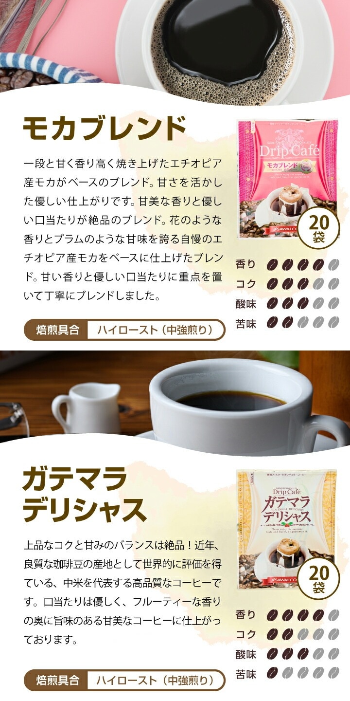 | 内容量 | ・モカブレンド 8g×20袋 ・ガテマラデリシャス 8g×20袋 ・濃い味ブレンド 8g×20袋 |