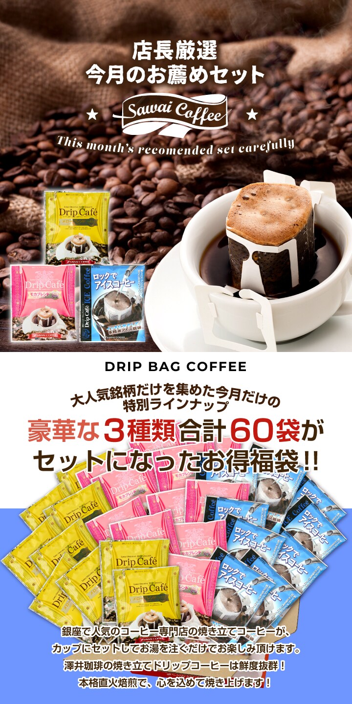 鮮度抜群 ドリップコーヒー 珈琲 ドリップパック 送料無料 コーヒー 福袋 ドリップバッグ 20袋×3種 個包装 飲み比べ セット 7月のおすすめドリップバッグ福袋 60杯分 澤井珈琲