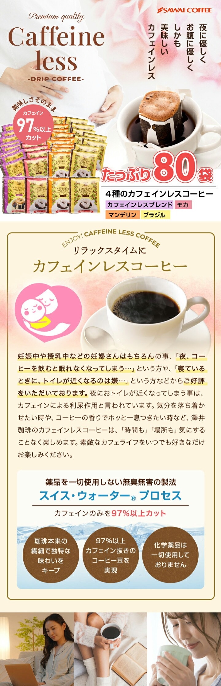 | こんな方にオススメです | 妊婦さんや授乳中のお母さん、夜コーヒーを飲んで眠れなくなる方: スイス・ウォーター? プロセスという特別な方法で作られており、化学薬品を一切使わずにカフェインを97%以上取り除いております。 自宅や職場で手軽にコーヒーを楽しみたい方: 手軽に淹れられるドリップパックなので、忙しい朝や休憩時間にも本格的なコーヒーを楽しめます。 色々な種類を楽しみたい方: 4種類入っているのでお好きな味を見つけて頂けます。 |