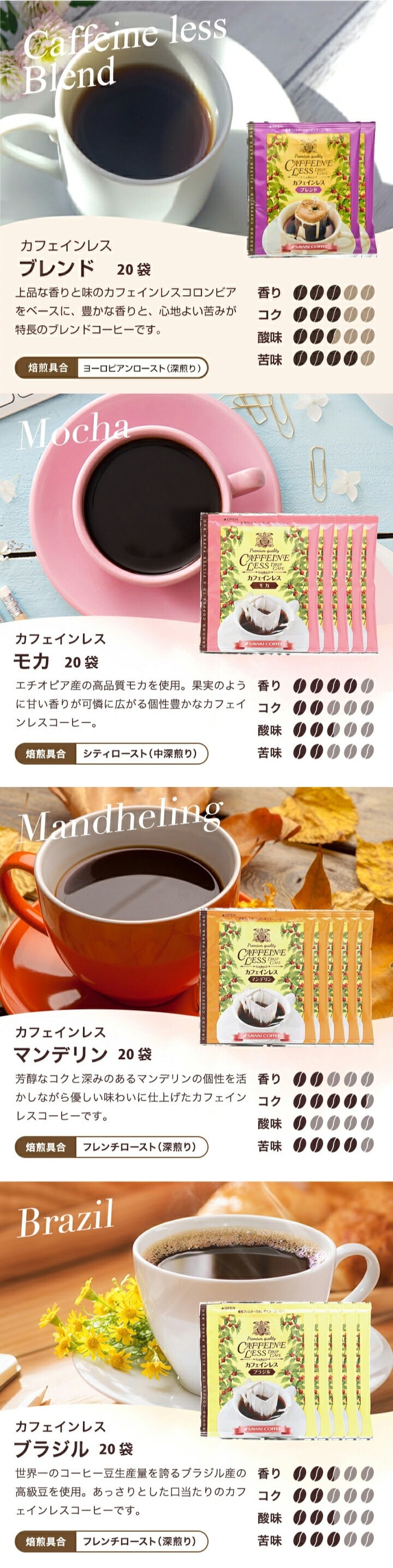 | 産地 | 【カフェインレスマンデリン】インドネシア 【カフェインレスブレンド】コロンビア、ベトナム 【カフェインレスブラジル】ブラジル 【カフェインレスモカ】エチオピア |