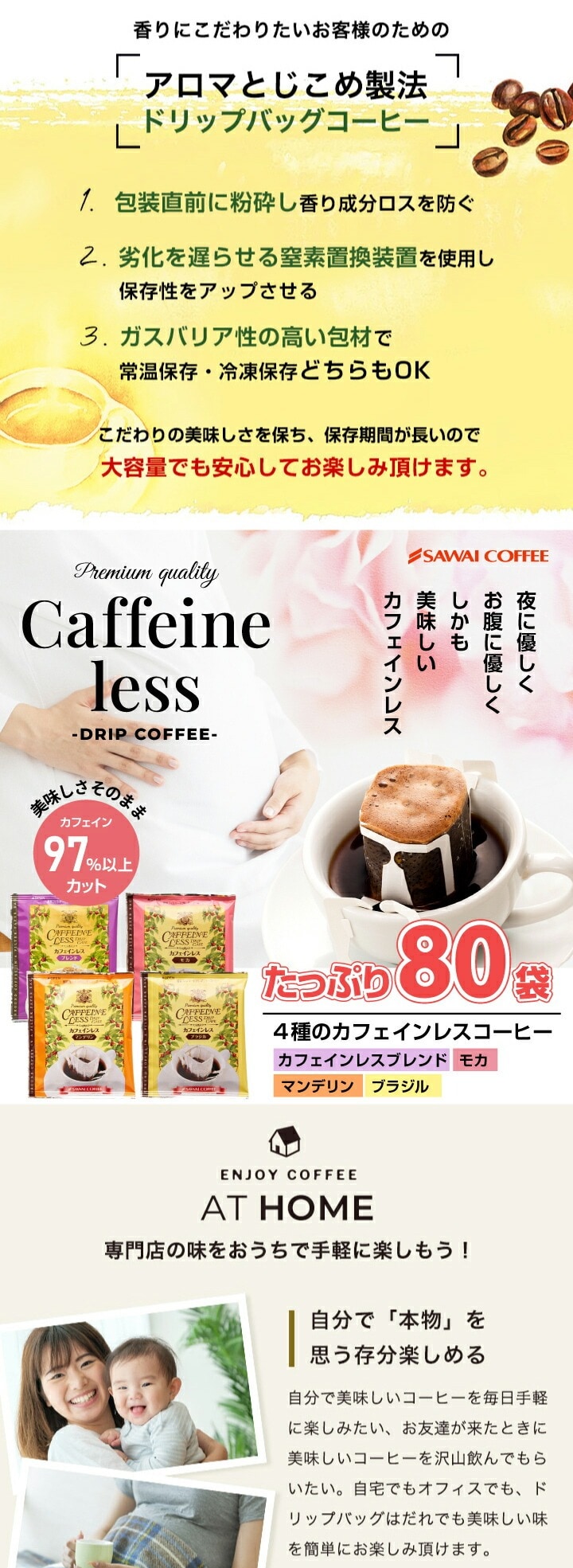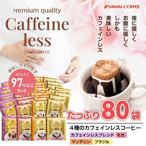 送料無料 カフェインレス ドリップバッグ コーヒー4種80個入り 個包装(ドリップカフェ/珈琲/カフェインレスコーヒー/デカフェ/出産祝い/個包装/送料込)
