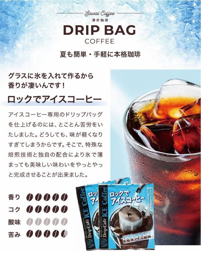 | 澤井珈琲の夏限定アイス専用ドリップバッグは、氷を入れたグラスに注ぐだけで、簡単に香り豊かな本格アイスコーヒーが楽しめます。特殊な焙煎技術で、氷で薄まっても美味しさをキープします。 1. 簡単に作れるアイスコーヒー 澤井珈琲のアイス専用ドリップバッグは、忙しい日常でも手軽に本格的なアイスコーヒーが楽しめる商品です。氷を入れたグラスにドリップバッグをセットし、お湯を注ぐだけで、香り高いアイスコーヒーが完成します。この手軽さは、コーヒーを飲みたいけれど時間がない方や、初心者の方にもおすすめです。簡単な手順でプロの味わいを楽しめるので、家でも外出先でも美味しいアイスコーヒーを手軽に楽しめます。 2. 夏限定の特別な味わい このアイス専用ドリップバッグは、夏限定の商品です。夏の暑い日には、冷たくて香り豊かなアイスコーヒーがぴったりです。特殊な焙煎技術と独自の配合により、氷で薄まっても味が軽くならず、濃厚で美味しいアイスコーヒーを楽しむことができます。夏の暑さを忘れさせる爽やかな一杯は、家族や友人とのひとときをより特別なものにしてくれます。 3. 香りとコクが抜群 澤井珈琲のアイス専用ドリップバッグは、香りとコクが抜群です。焙煎技術にこだわり、香りがしっかりと引き立つように作られているため、一気に冷やしても香りがしっかり感じられます。また、コクのある味わいも特徴で、飲むたびに深い満足感を味わえます。酸味は控えめで、苦味も適度にあり、バランスの取れた味わいです。香り高くコクのあるアイスコーヒーが好きな方にはぴったりの商品です。 |