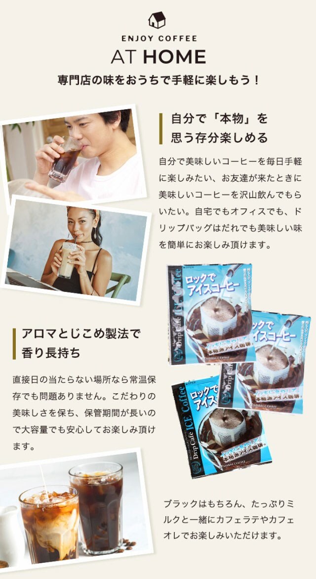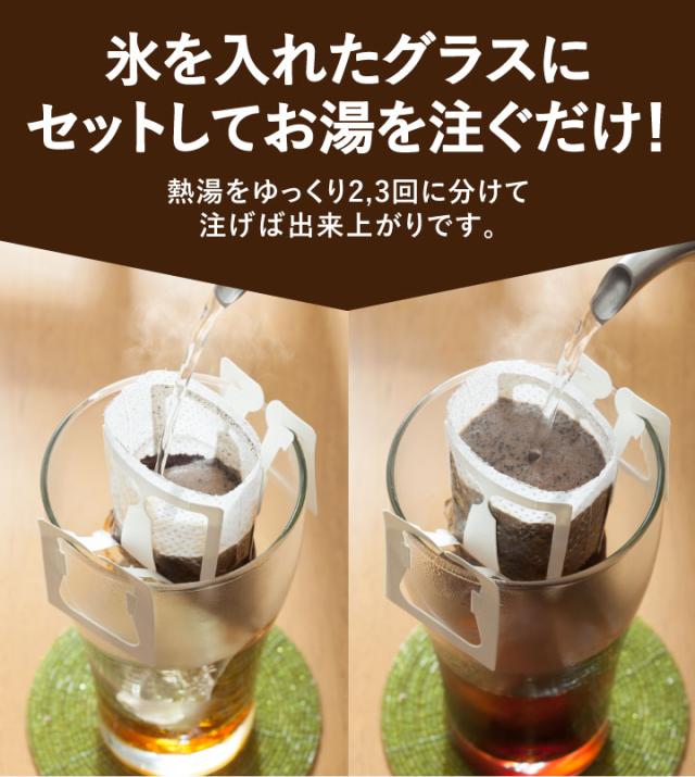 | こんな方にオススメです | 簡単にアイスコーヒーを作りたい方: 氷を入れたグラスにドリップバッグをセットし、お湯を注ぐだけで簡単に美味しいアイスコーヒーが完成します アウトドアで楽しむために購入する方: キャンプやピクニックなどのアウトドア活動で、美味しいアイスコーヒーを楽しみたい方にぴったりです |