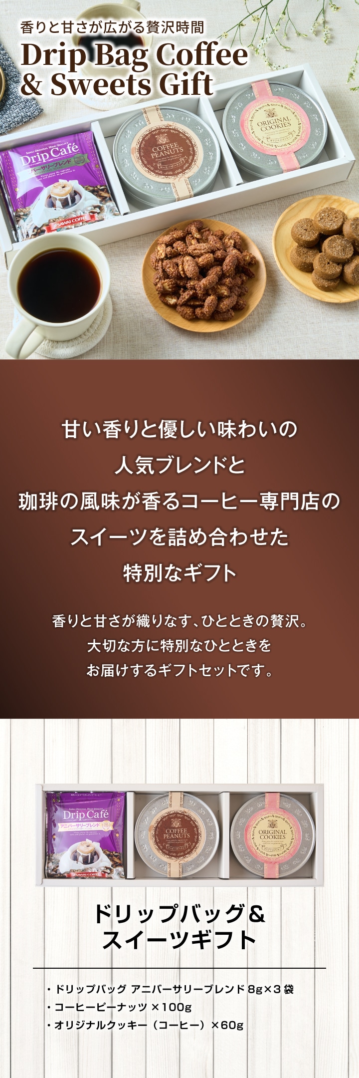 | この商品は、香り豊かなドリップバッグコーヒーとコーヒー専門店のスイーツが詰まったギフトセットです。甘く優しい味わいのコーヒーと、それに合うピーナッツやクッキーが、リラックスしたひとときを演出します。大切な人への贈り物に最適な特別なセットです。 1. 甘い香りと優しい味わいのドリップバッグコーヒー このセットのドリップバッグコーヒー「アニバーサリーブレンド」は、カリブ海産の優しい味わいが特長です。淹れると同時に芳ばしい香りが広がり、飲む人の心をほっと温かく包み込みます。ミディアムハイローストの程よい苦みとコクがバランス良く、酸味も控えめなので、コーヒー初心者から愛好者まで楽しめます。さらに、ブルマンに似た香り豊かな風味が、コーヒータイムの贅沢なひとときを提供します。気軽に本格的なカフェ気分を味わえるのが、このコーヒーの魅力です。 2. サクサク食感と珈琲の香りが楽しめるオリジナルクッキー セットに含まれる「オリジナルクッキー(コーヒー)」は、口いっぱいに広がるモカの香りが特長です。サクサクとした食感が楽しめ、珈琲の芳ばしい香りと甘さが絶妙に調和しています。さらに、甘さの中にほんのりとした苦味がアクセントとなり、後を引く美味しさです。淹れたてのコーヒーや紅茶と一緒に味わうと、より一層特別な時間が広がります。ご家族や友人とリラックスした時間を楽しむのにぴったりのスイーツです。 3. コーヒーの奥行きを広げるコーヒーピーナッツ 「コーヒーピーナッツ」は、コーヒーの香りと相性抜群のピーナッツを使ったおやつです。カリッとした食感と程よい甘さが口の中で広がり、食べるとついつい手が止まらなくなります。ピーナッツの香ばしさとコーヒーの風味が一緒になり、普段のコーヒータイムを大人っぽく、贅沢な気分に変えてくれます。忙しい日々の中でも、このピーナッツで少し特別なひとときを楽しめるのが嬉しいポイントです。 | |